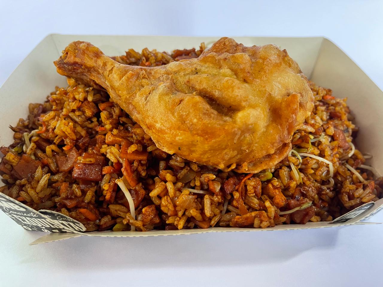 Arroz frito con jamon y verduras salteadas + porcion de pollo frito.+ gaseosa postobon (segun disponibilidad))