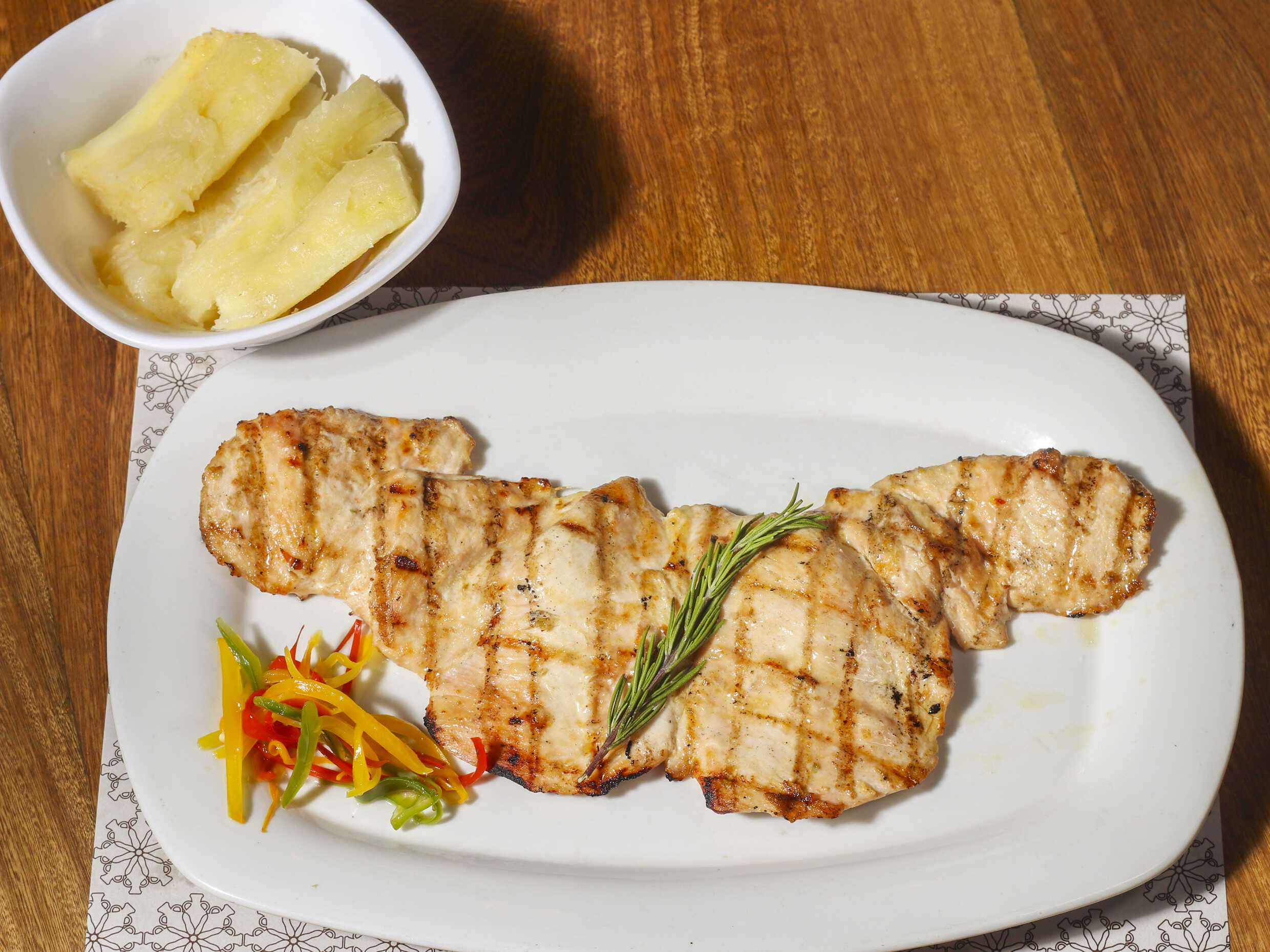 Costilla de cerdo a la parrilla bañada en salsa BBQ, acompañadas con papas a la francesa, cosidas o en cascos, yuca cocida o crocante, arroz blanco o de almendras, según su preferencia.
