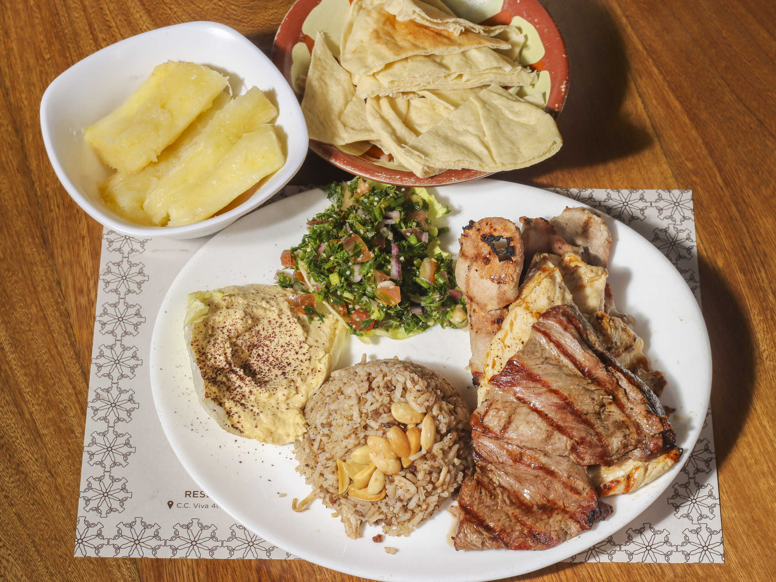 Dos chuzos de lomo fino, tahine hummus y tabbouleh y pan árabe, acompañadas con papas a la francesa, cosidas o en cascos, yuca cocida o crocante, arroz blanco o de almendras, según su preferencia.