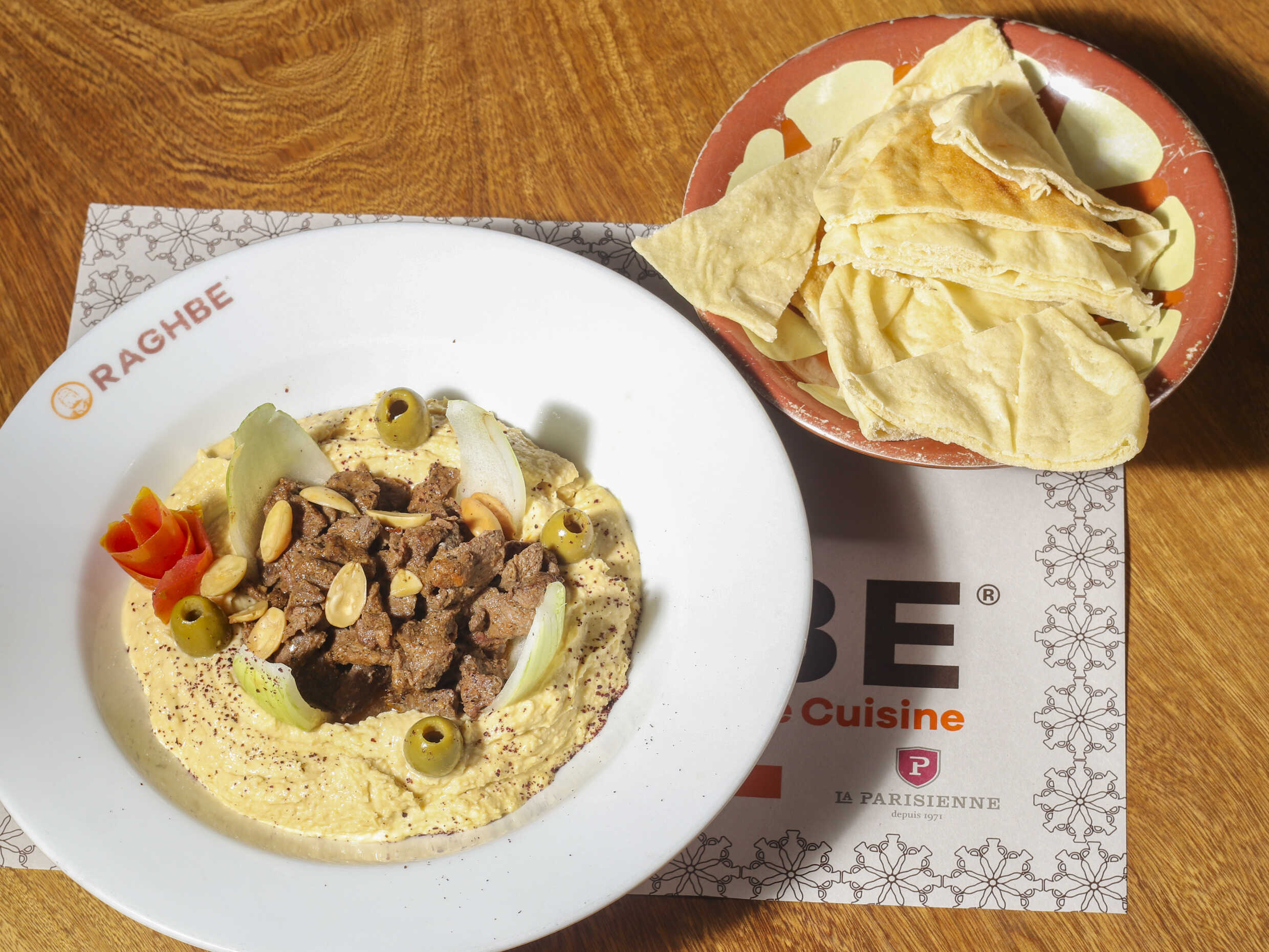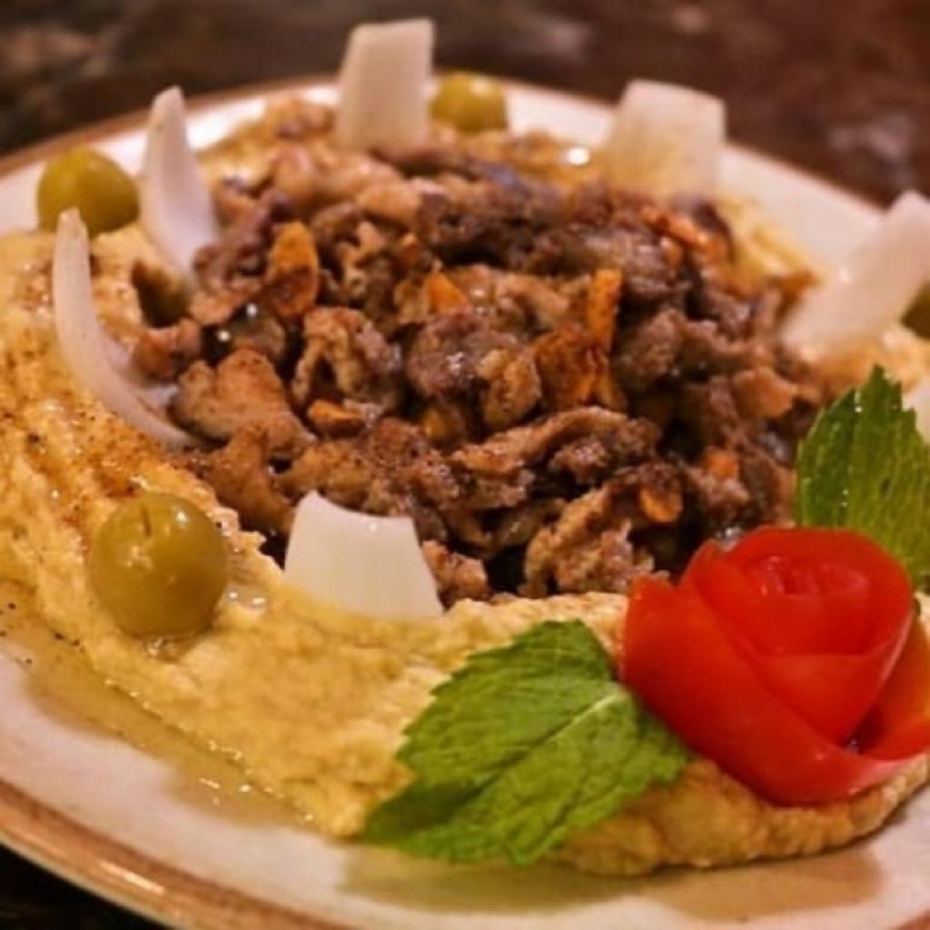 Tahine de garbanzo con pastas de ajonjoli, julianas de carne y pollo, ajo y limon almendras, mantequilla y especias Baharat.