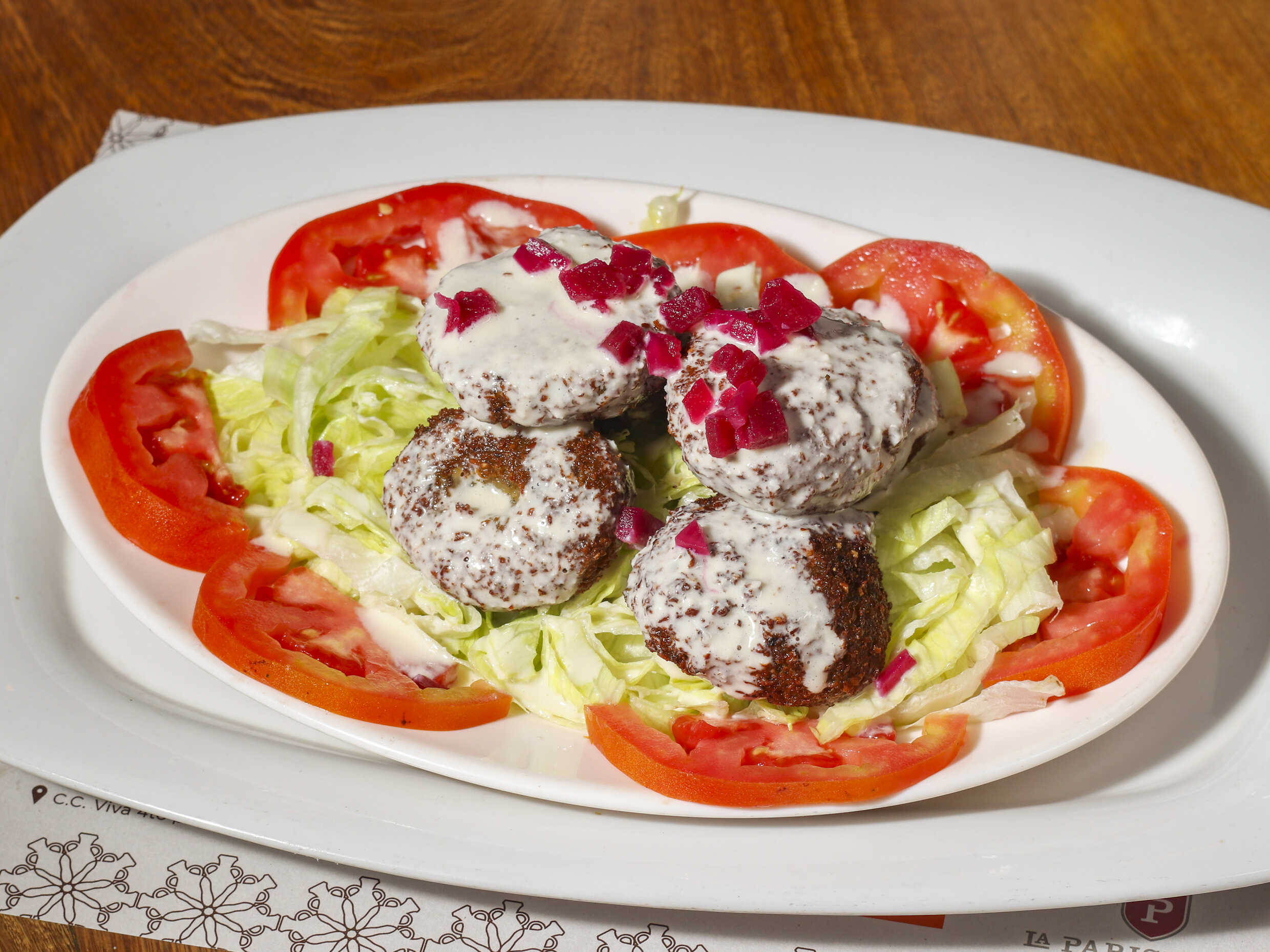 Croquetas fritas de garbanzo y habas con ajo, cebolla y especias arabes. Acompañadas con salsa tahin, lechuga, tomate. pepino y hierbabuena, servido en plato.
