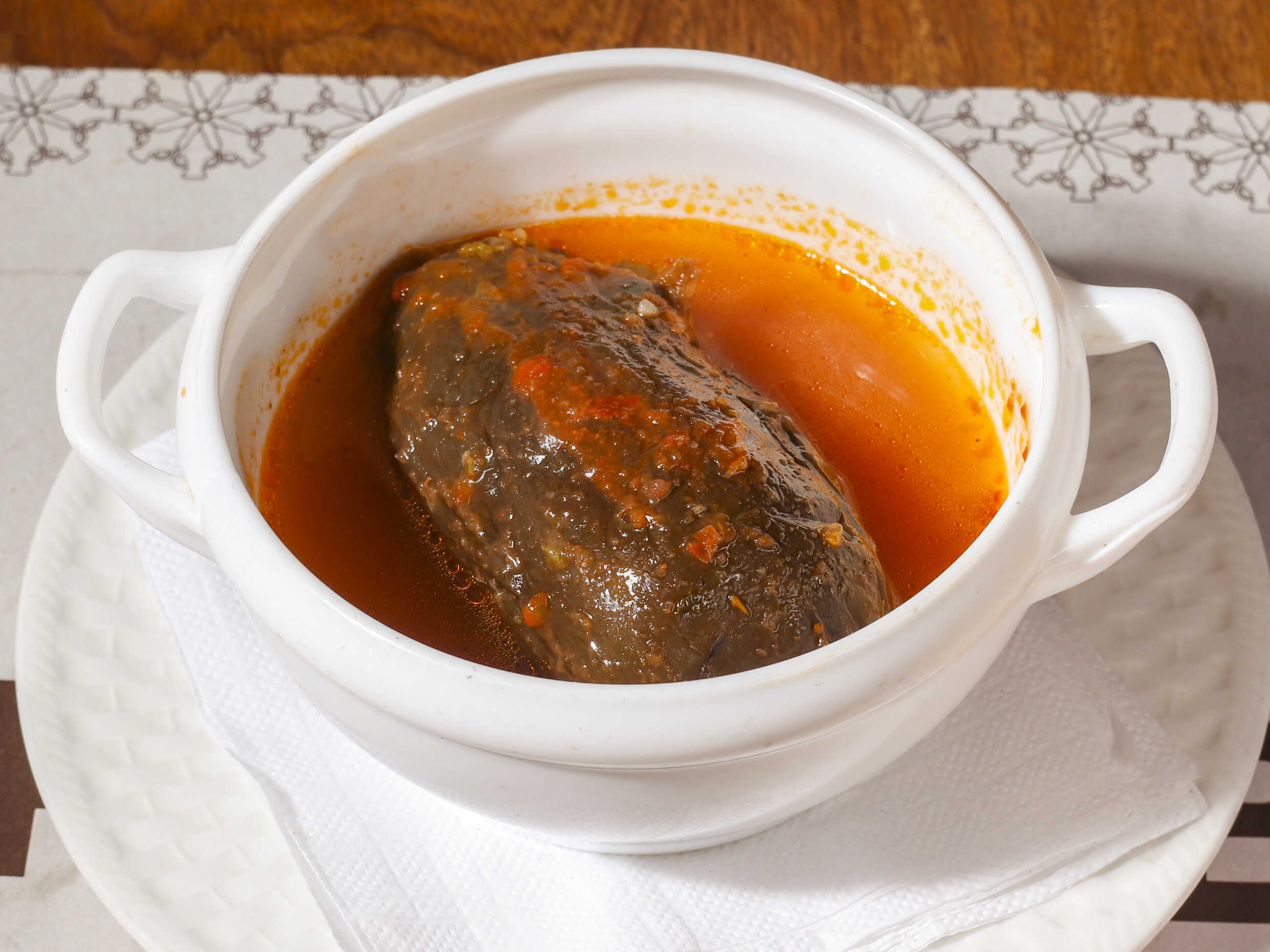 Rellena de carne de res finamente picada, arroz, albahaca y hierbabuena, banada en una reduccion de tomates
