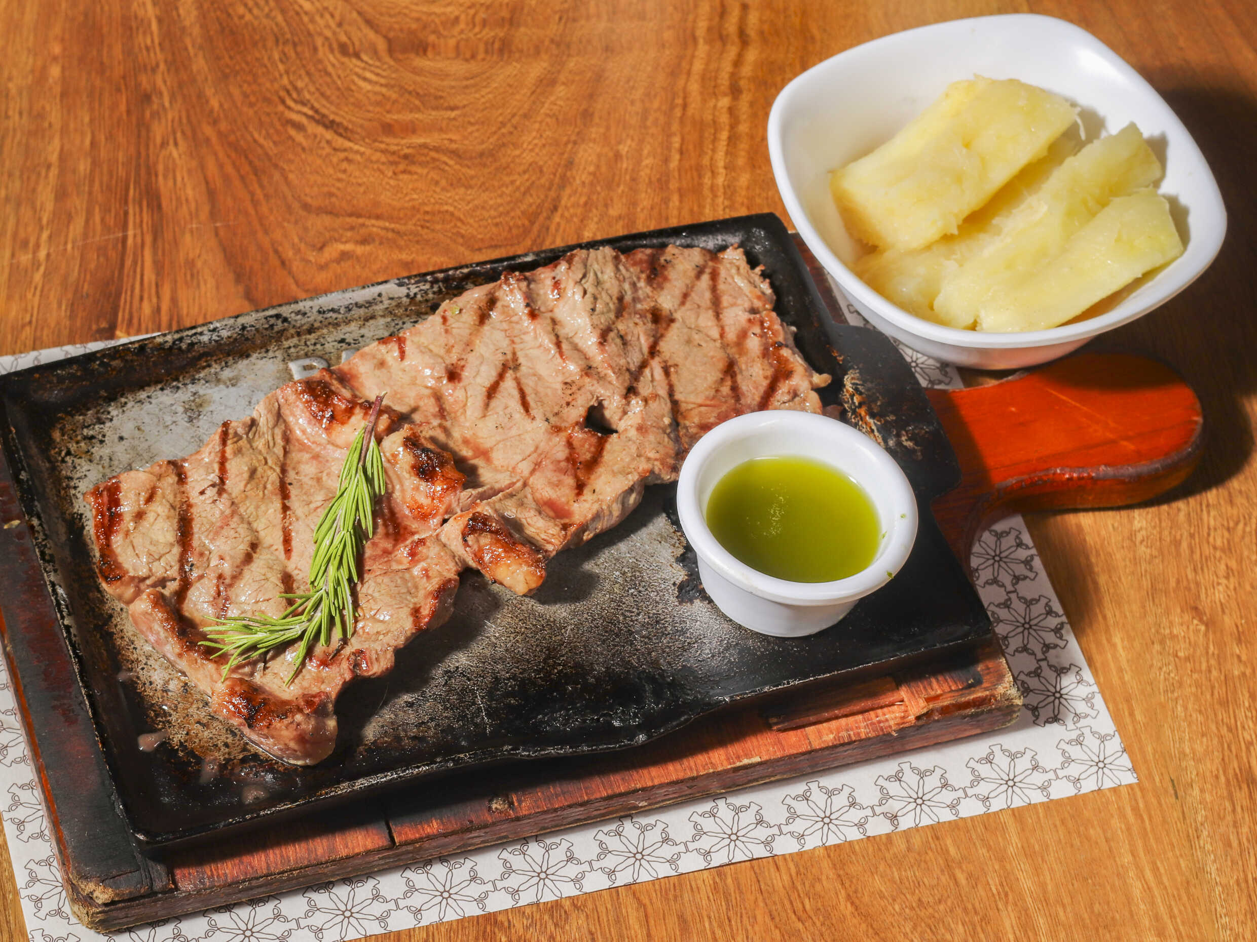 Lomo fino salteado en mantequilla, acompañadas con papas a la francesa, cosidas o en cascos, yuca cocida o crocante, arroz blanco o de almendras, según su preferencia.