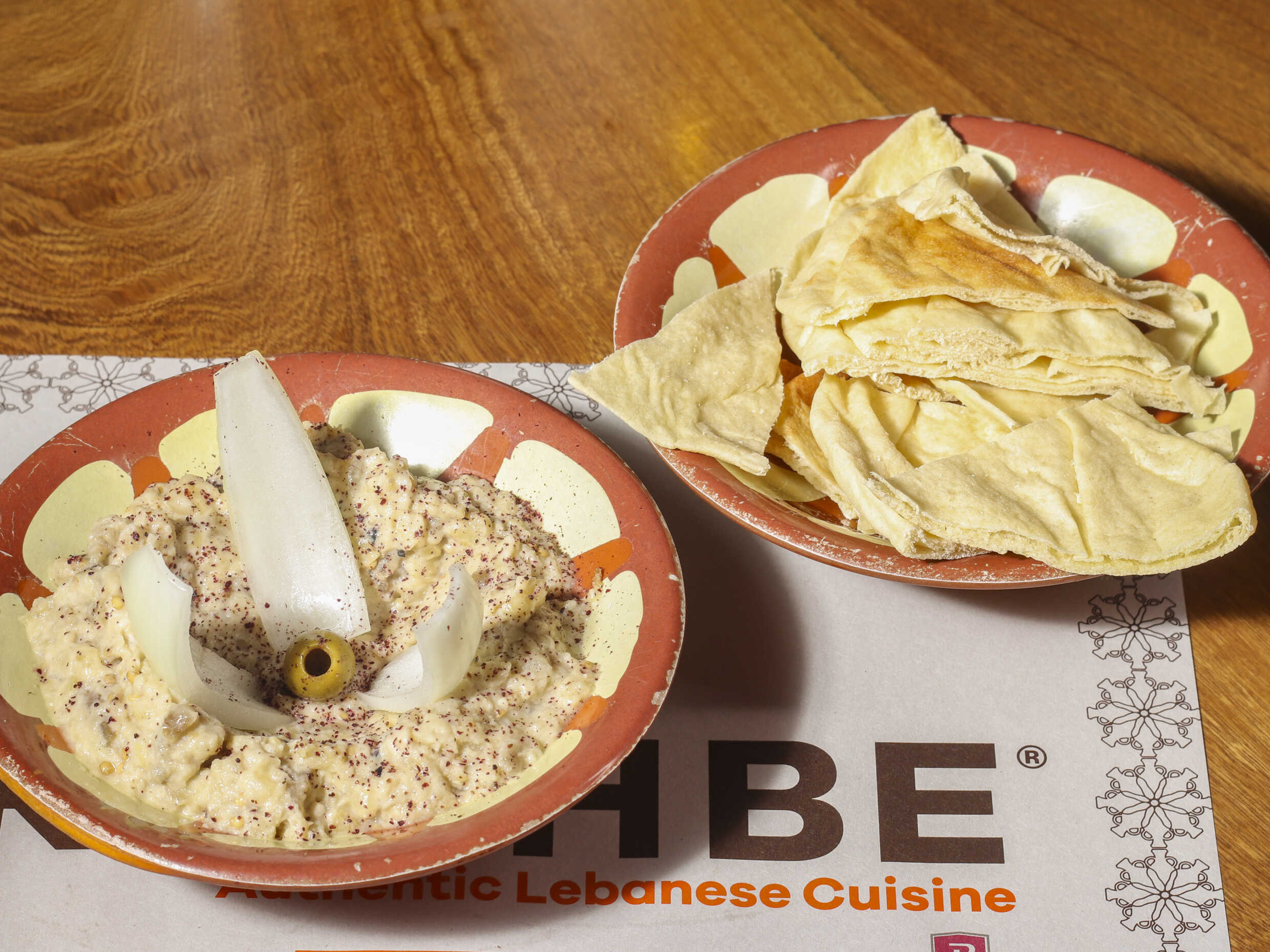 Arroz de almendras, hojas de parra, hojas de repollo, kibbeh frito, tahine hummus, tabboulet, kafta, berenjena rellena y pan árabe.