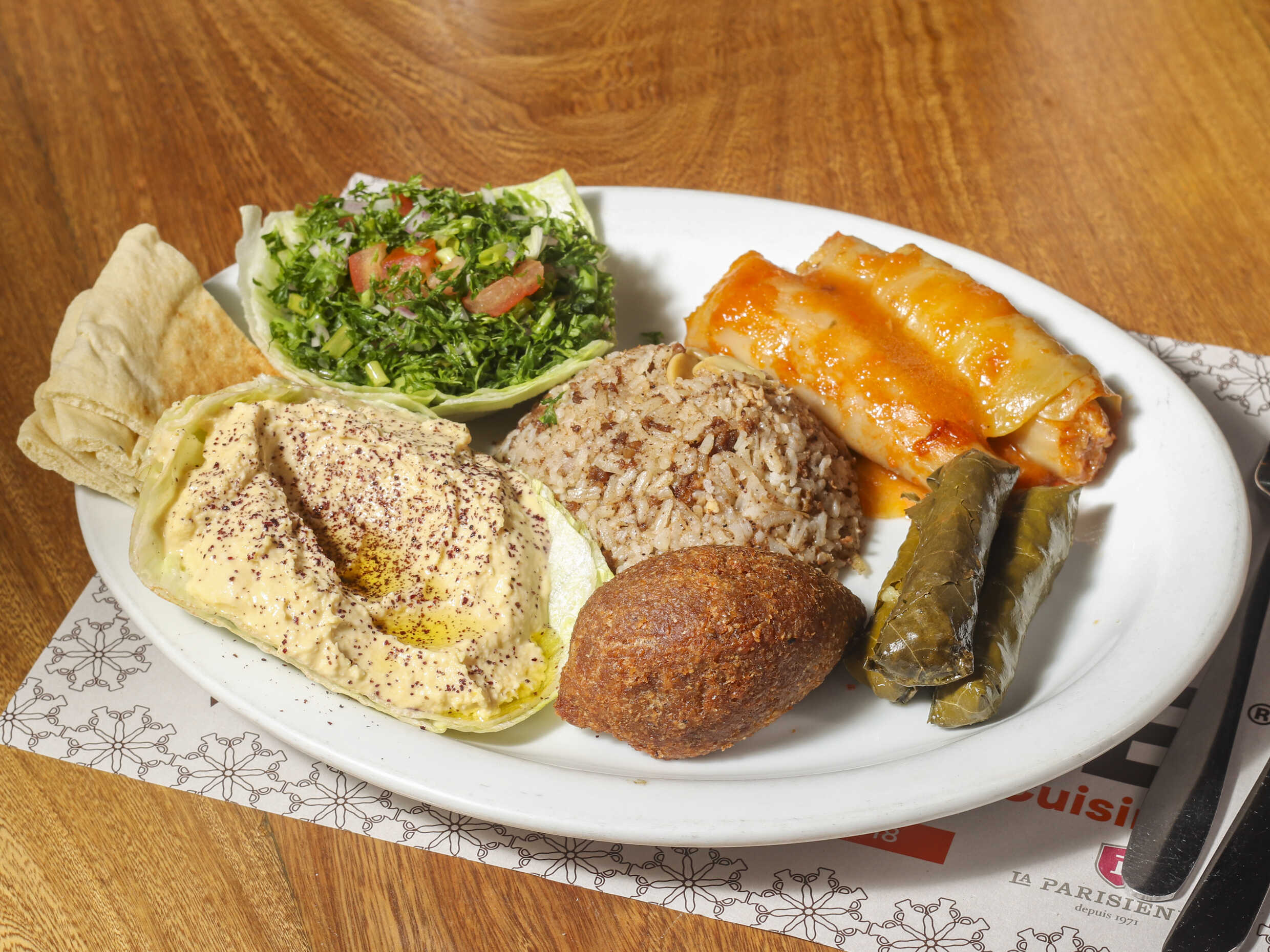 Arroz de almendras, hojas de parra, hojas de repollo, kibbeh frito, tabbouleh, tahine hummus y pan árabe.
