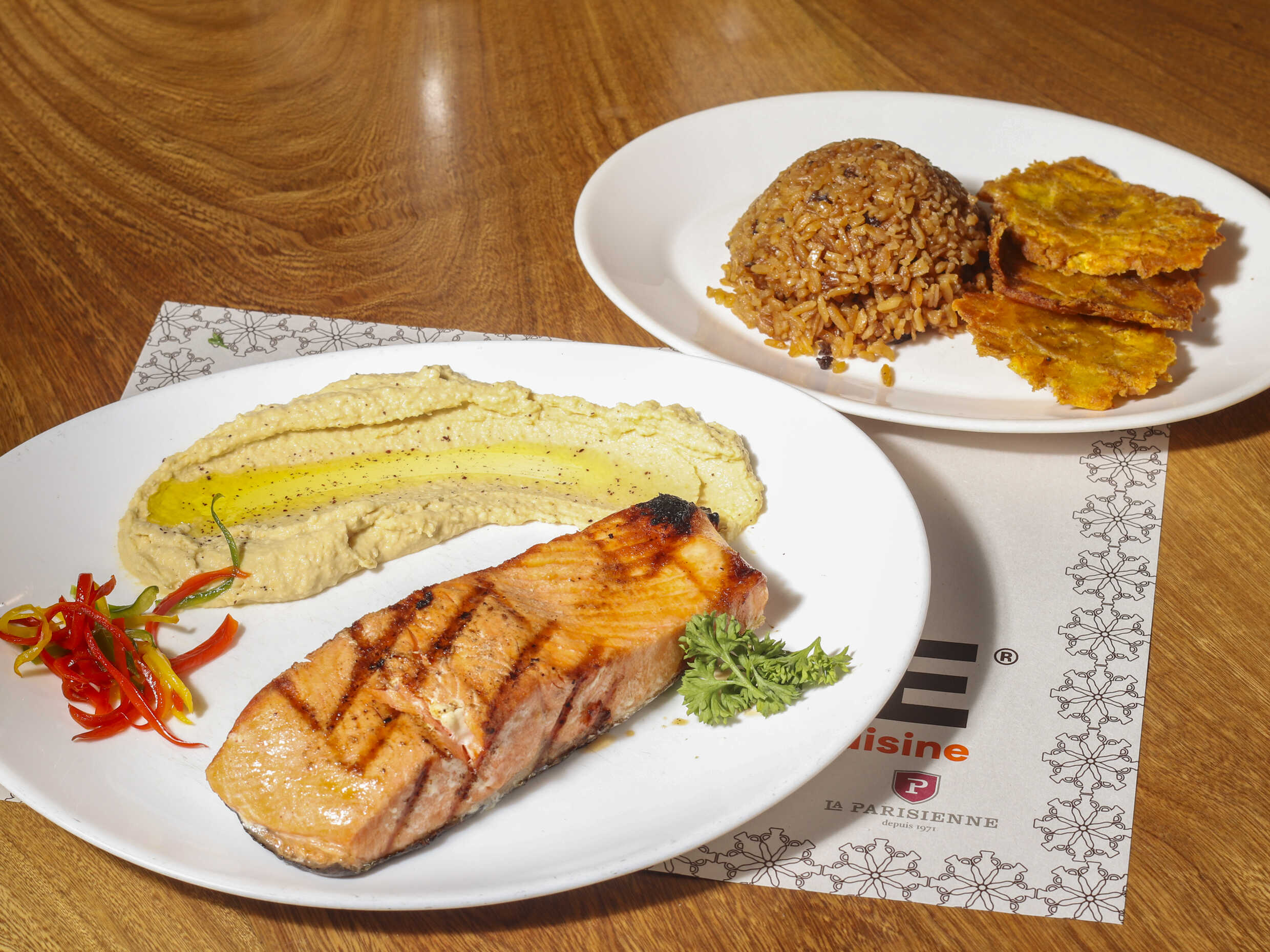 Salmón a la parrilla, acompañado con patacones y arroz de coco.
