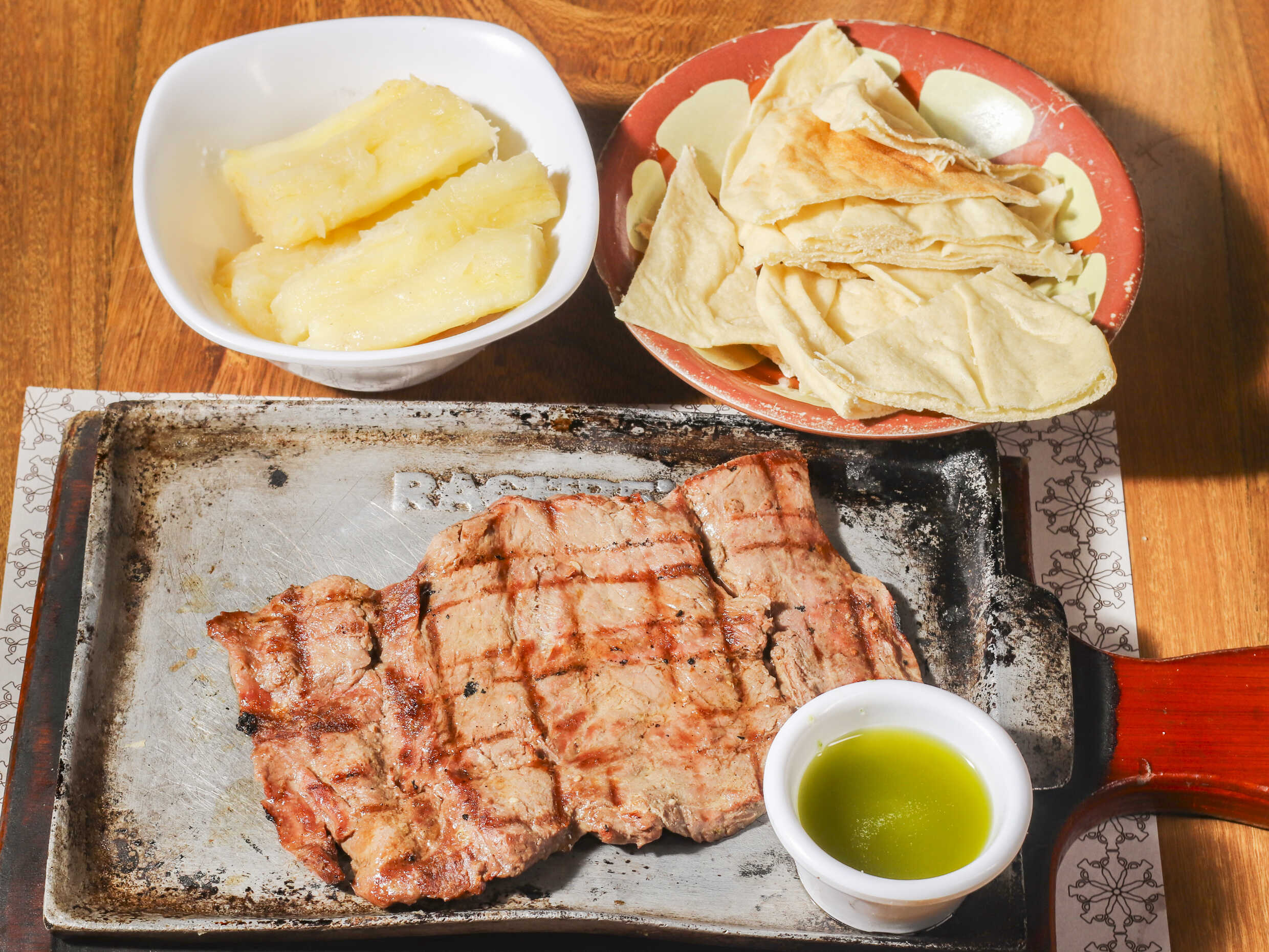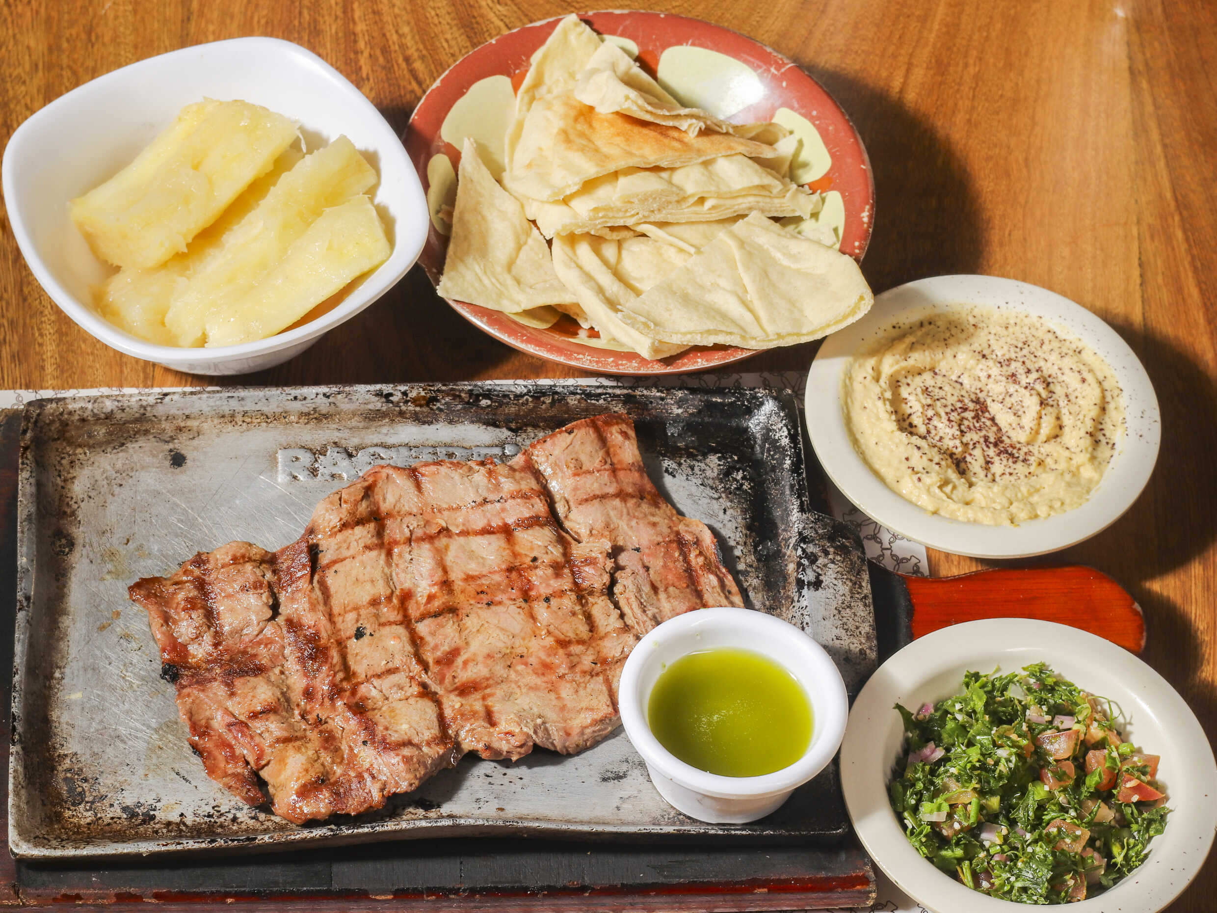 Lomo fino de res, acompañado con tabbouleh, tahine hummus y crema de ajo, pan árabe, acompañadas con papas a la francesa, cosidas o en cascos, yuca cocida o crocante, arroz blanco o de almendras, según su preferencia.