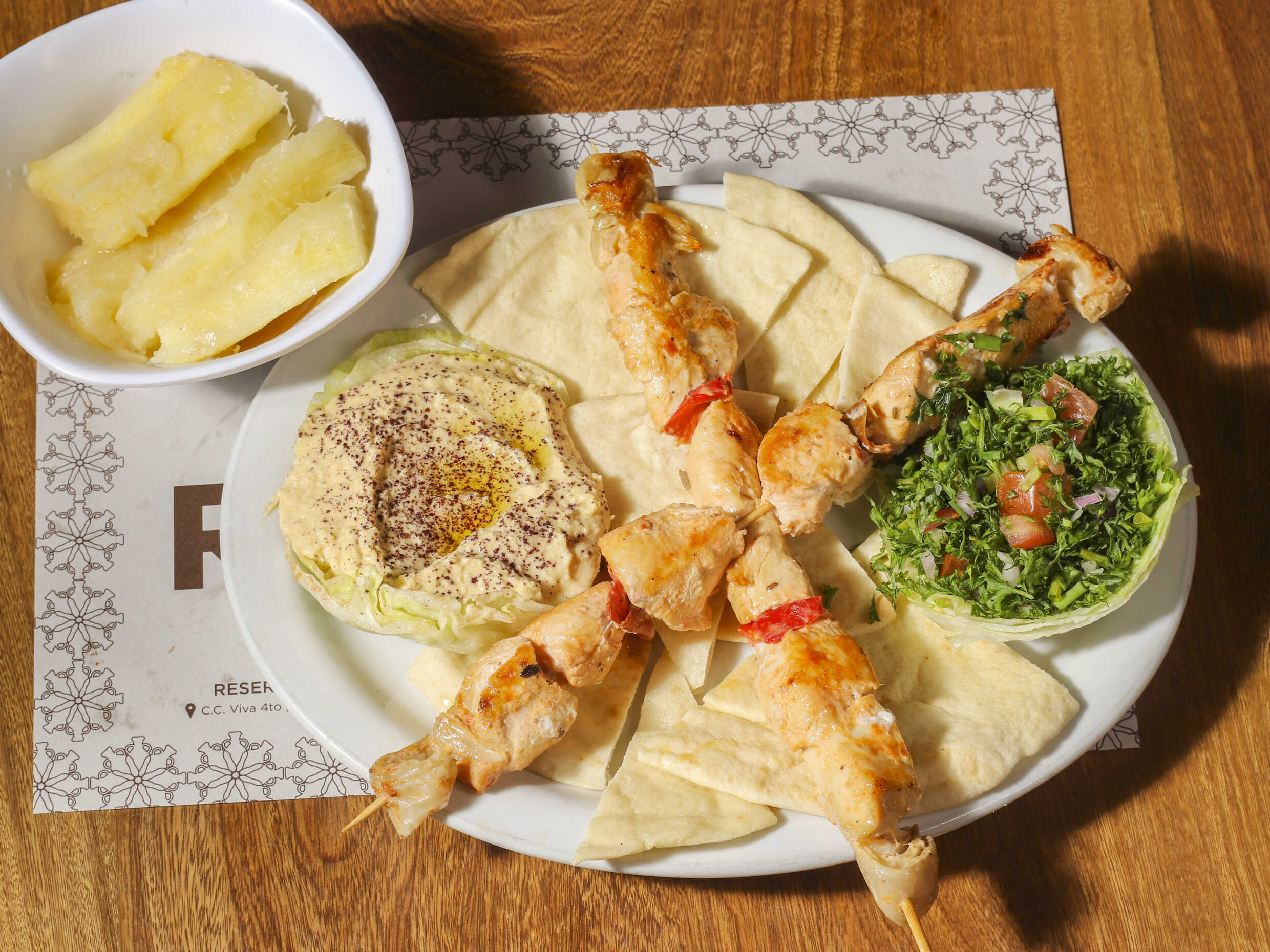 Dos chuzos de pechuga de pollo asada, tahine hummus y tabbouleh, acompañadas con papas a la francesa, cosidas o en cascos, yuca cocida o crocante, arroz blanco o de almendras, según su preferencia.