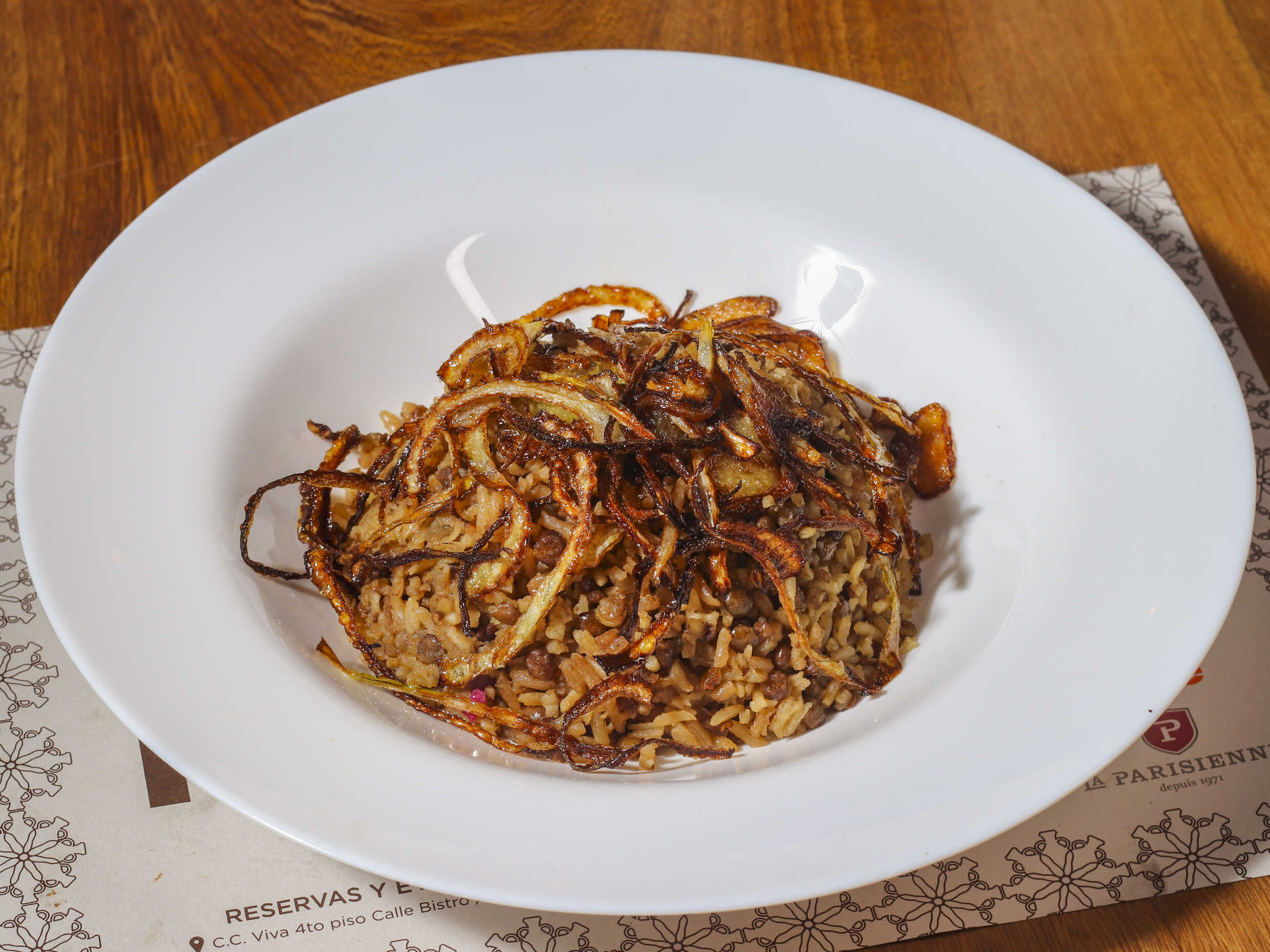 Arroz con lentejas cubierto de cebollas caramelizadas.