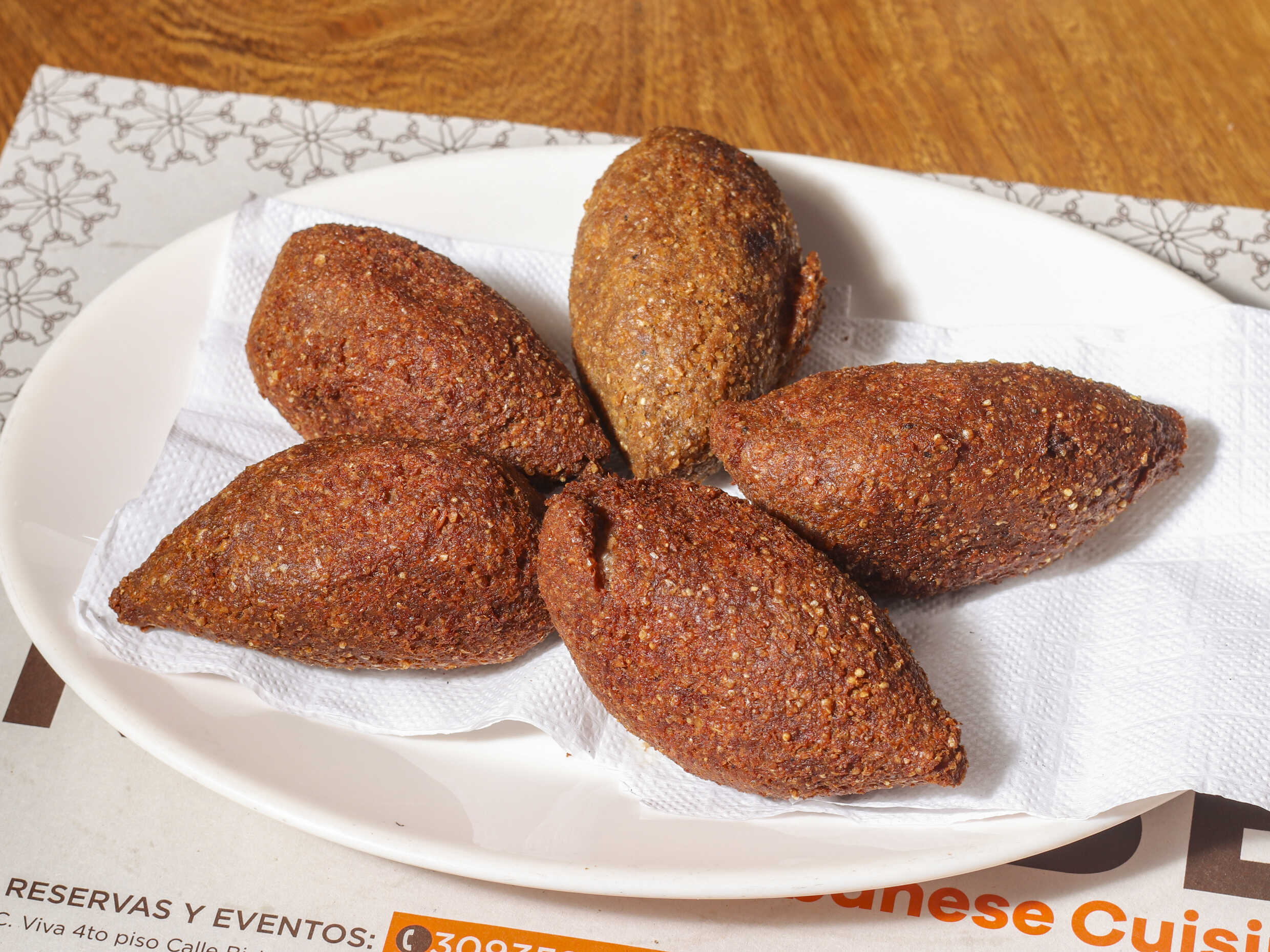 Croquetas de carne de res y trigo, rellena de carne, snoubar, cebolla y hierbabuena