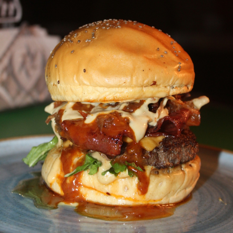 Carne americana, mix de queso cheddar y mozzarella, tocineta, aros de cebolla, lechuga y reducción de manzana verde en ron y pimienta cayena.