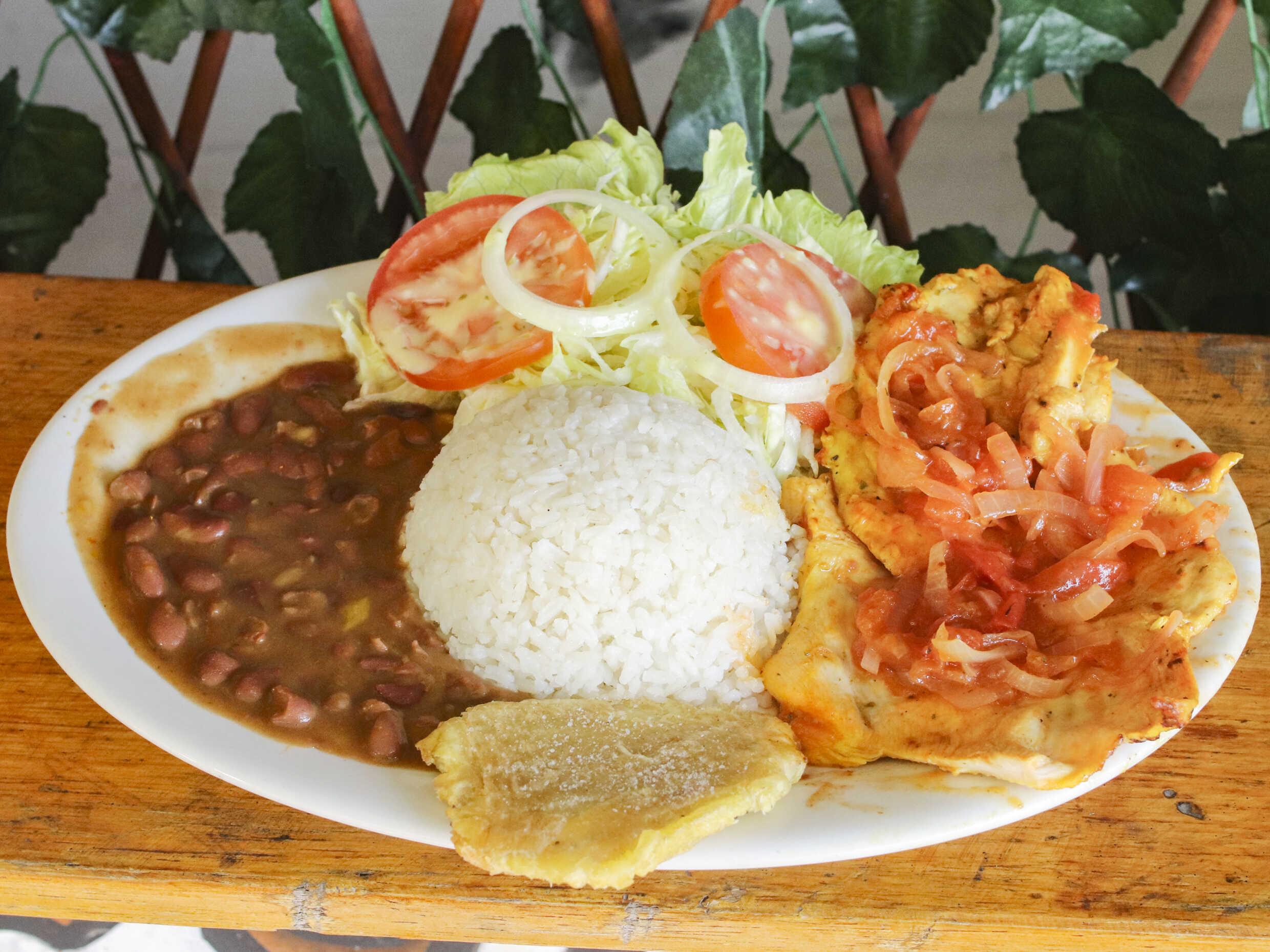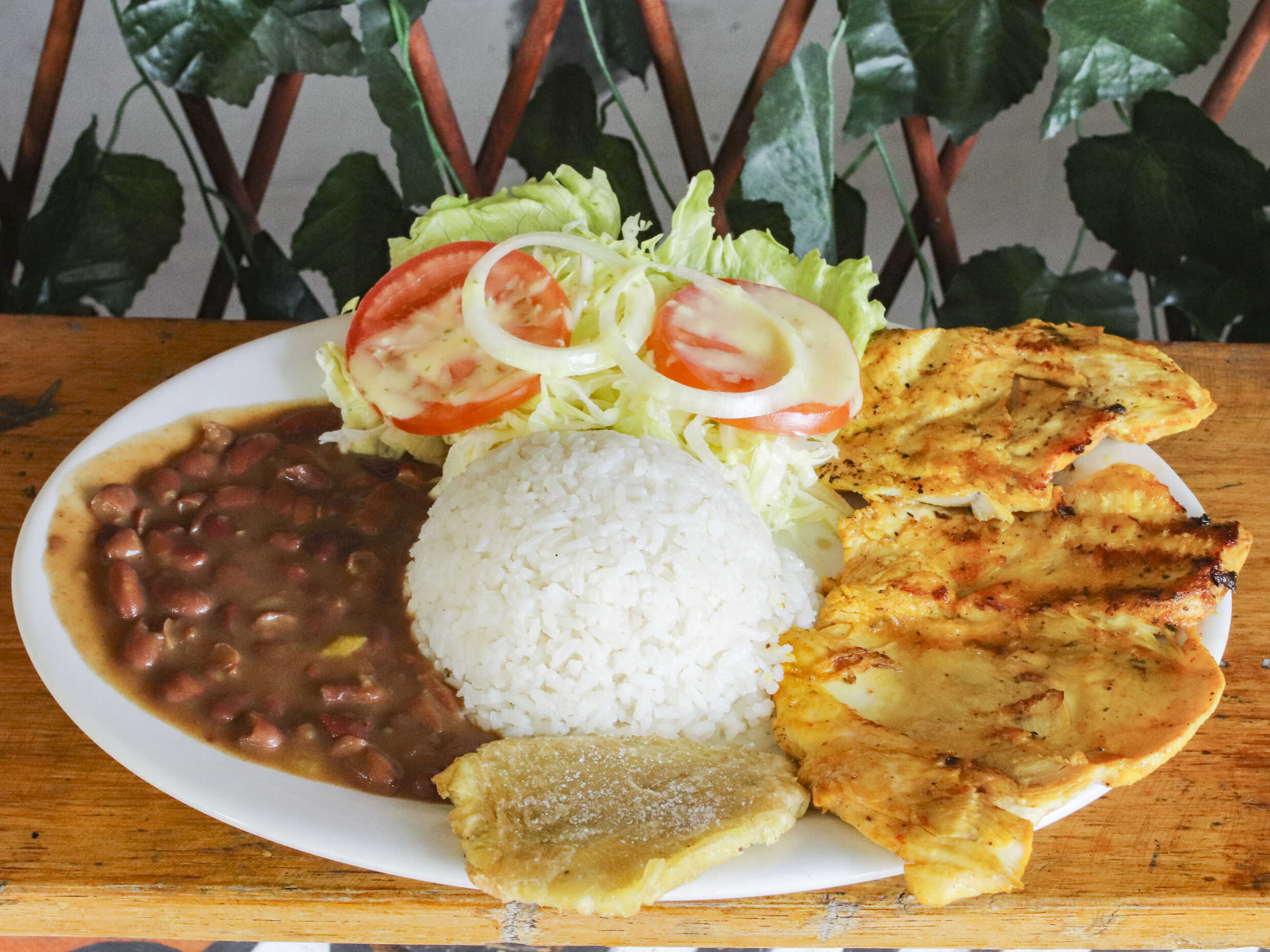 Pechuga de pollo, carne de res, chorizo, butifarra, papas a la francesa ensalada de tomate, lechuga, cebolla, salsa de la casa.