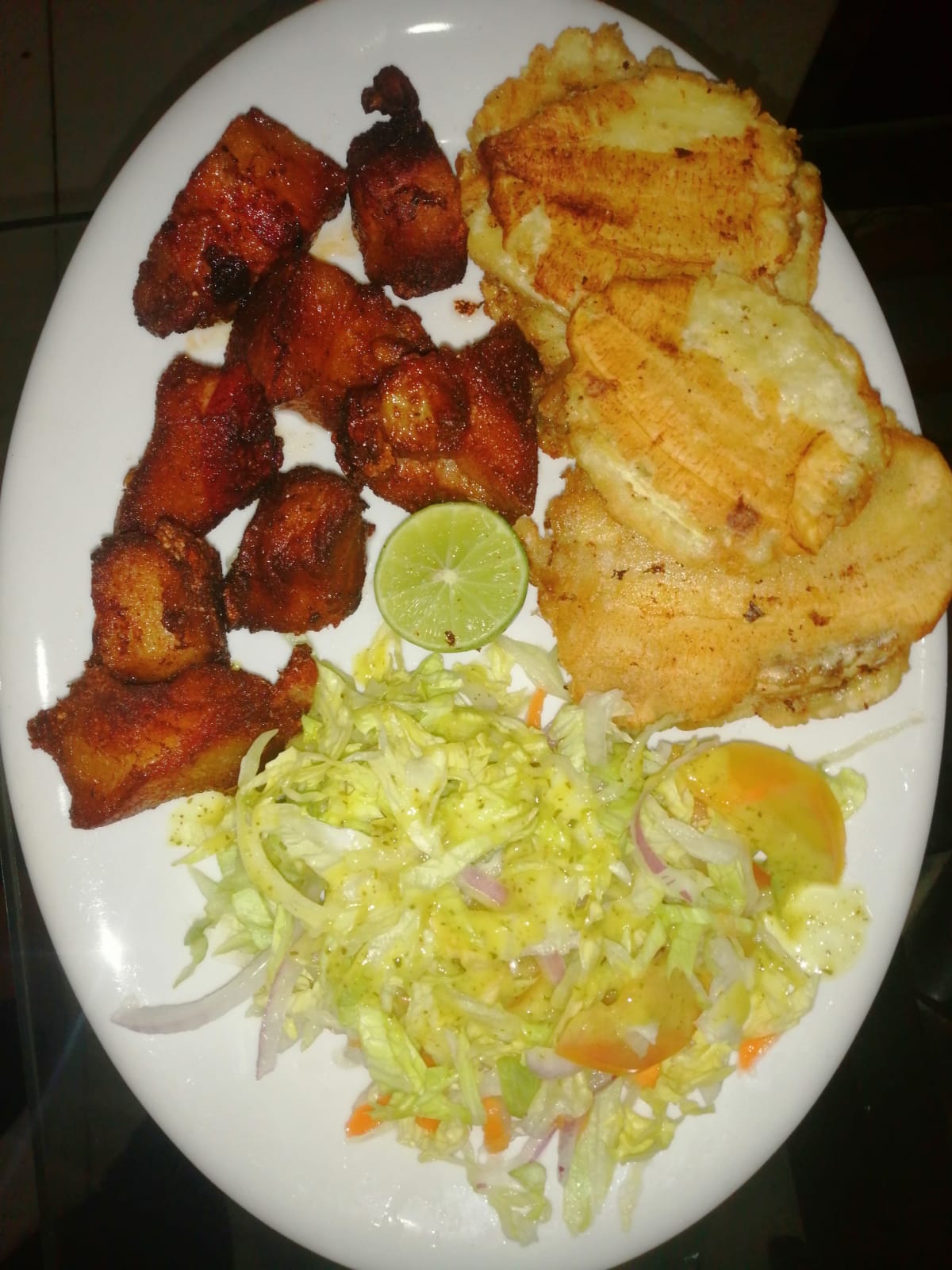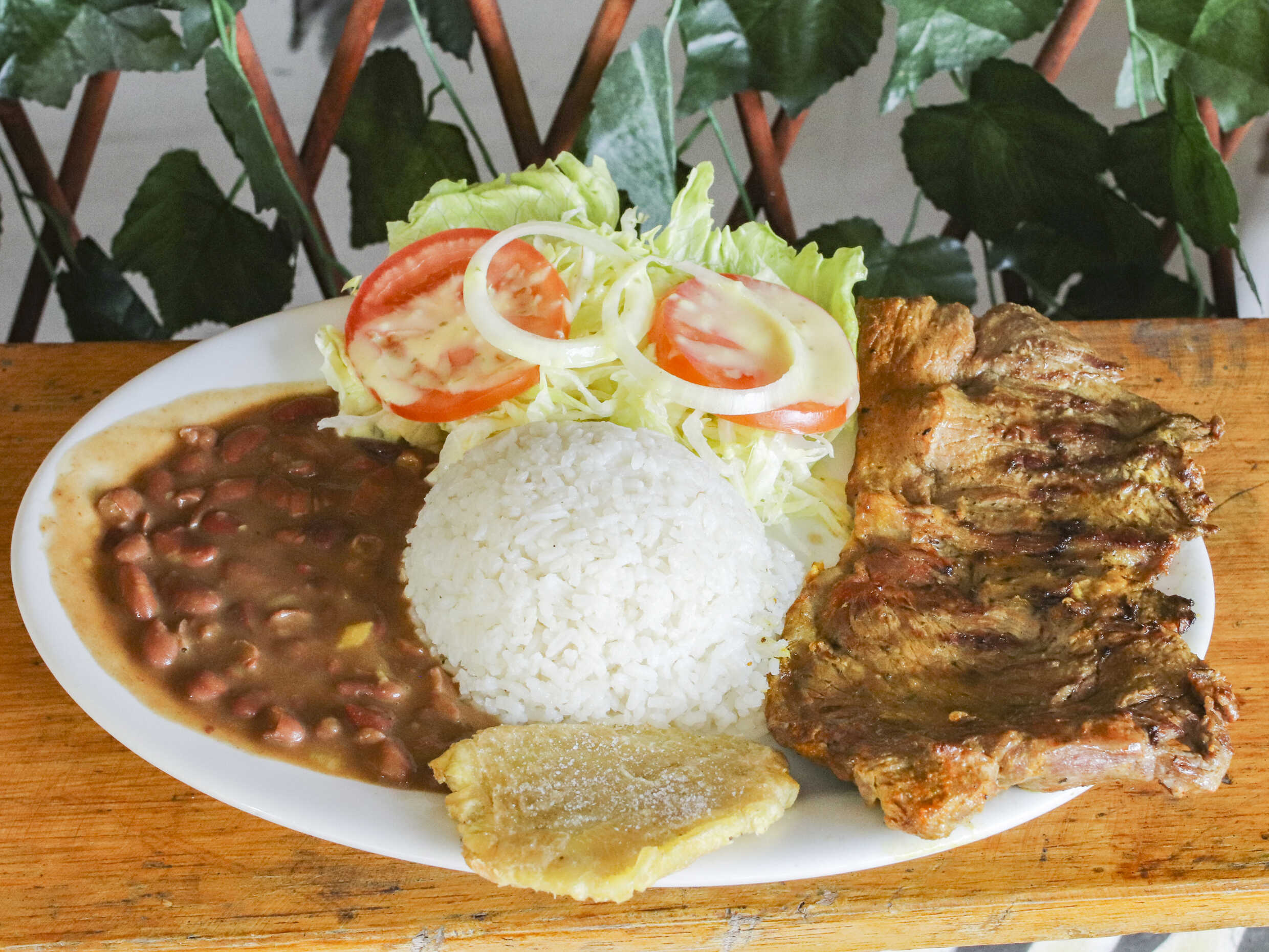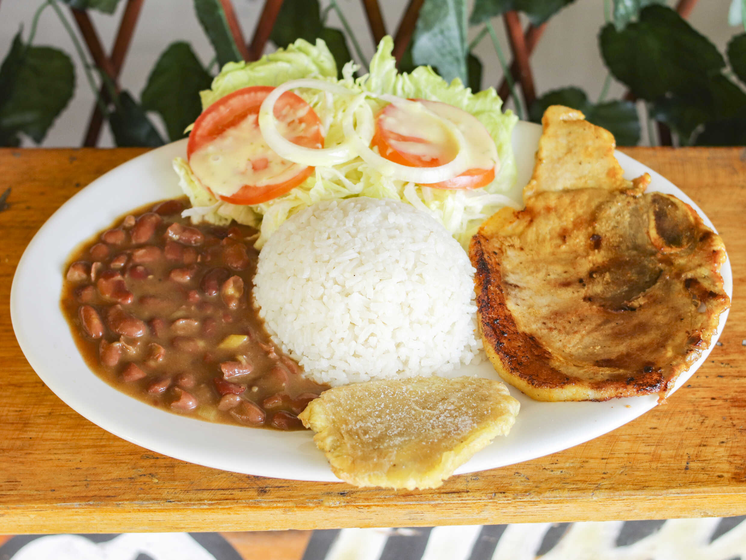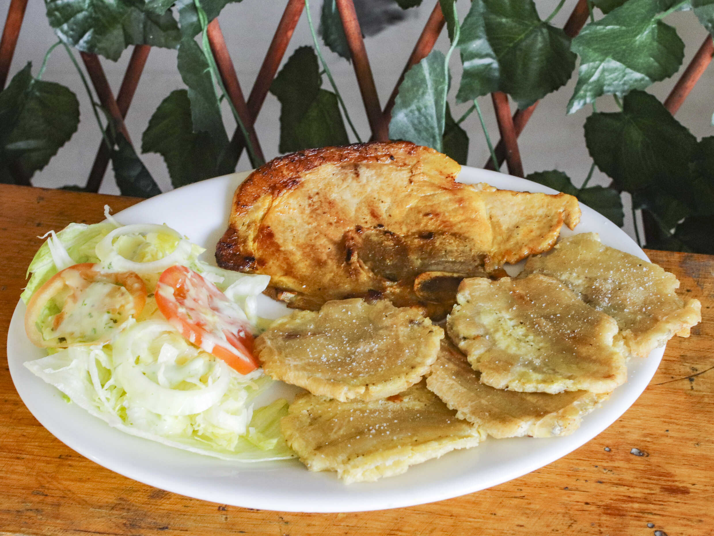 Chuleta asada, patacon, ensalada verde,.