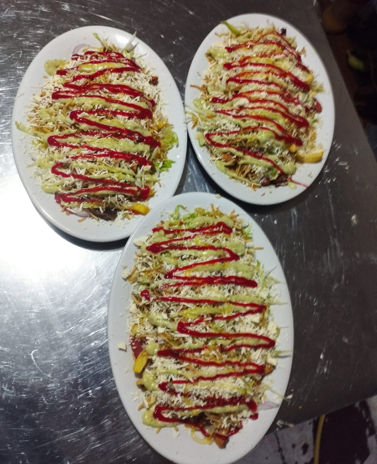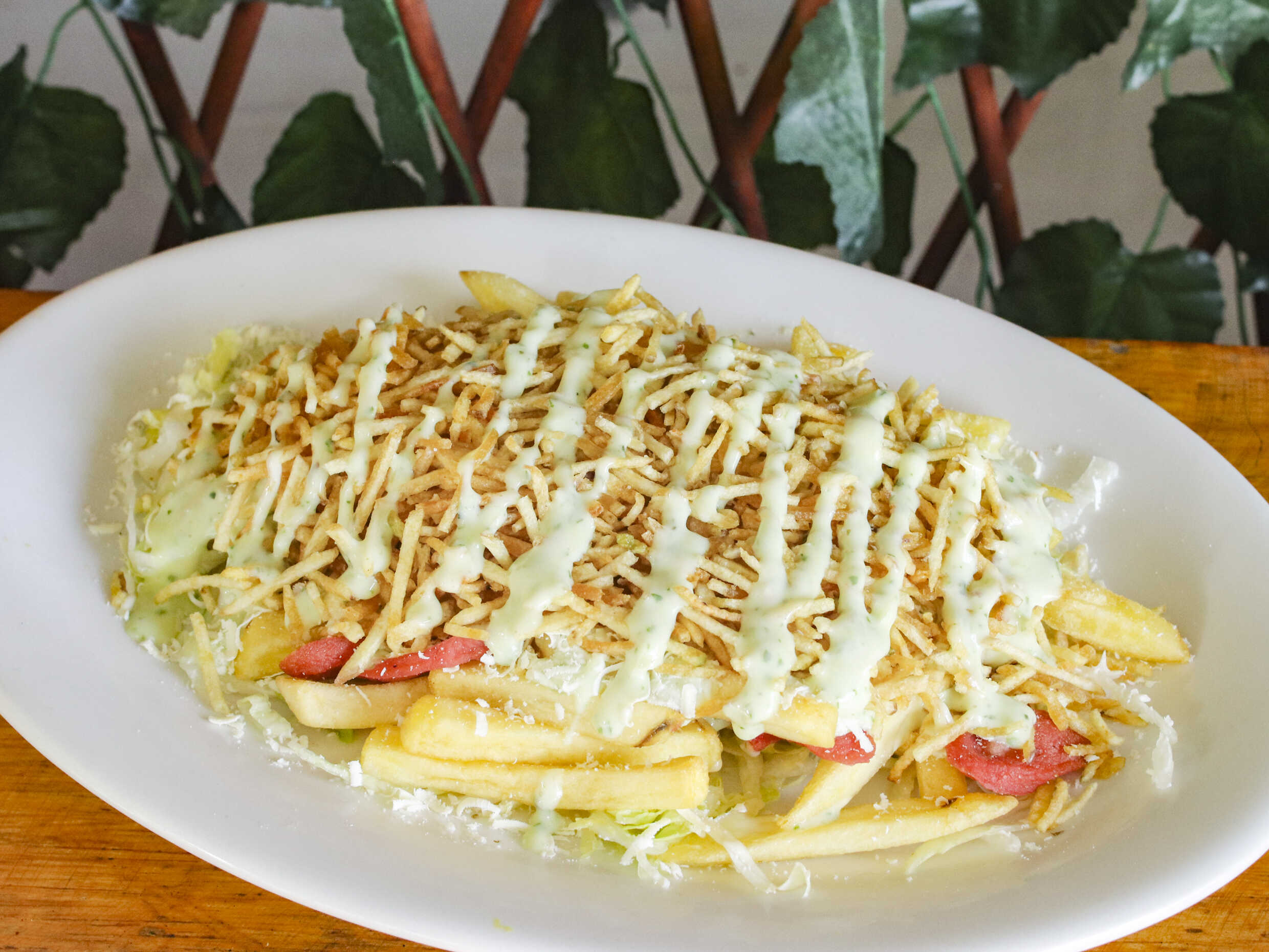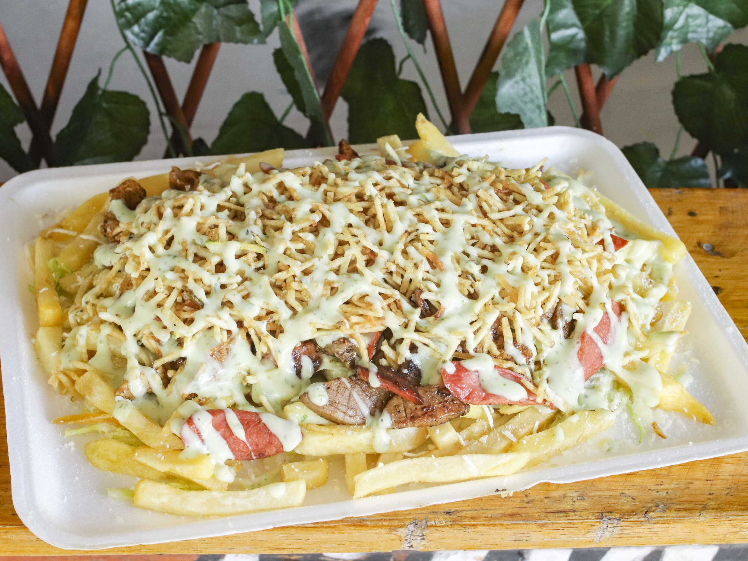 Papas a la francesa, salchicha, lechuga, queso costeño, papa chongo, salsa de tomate, salsa tártara, salsa de piña.
