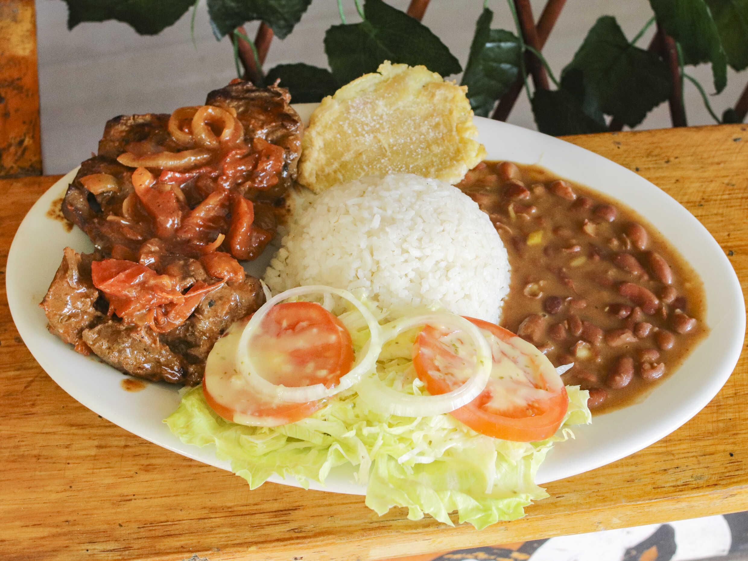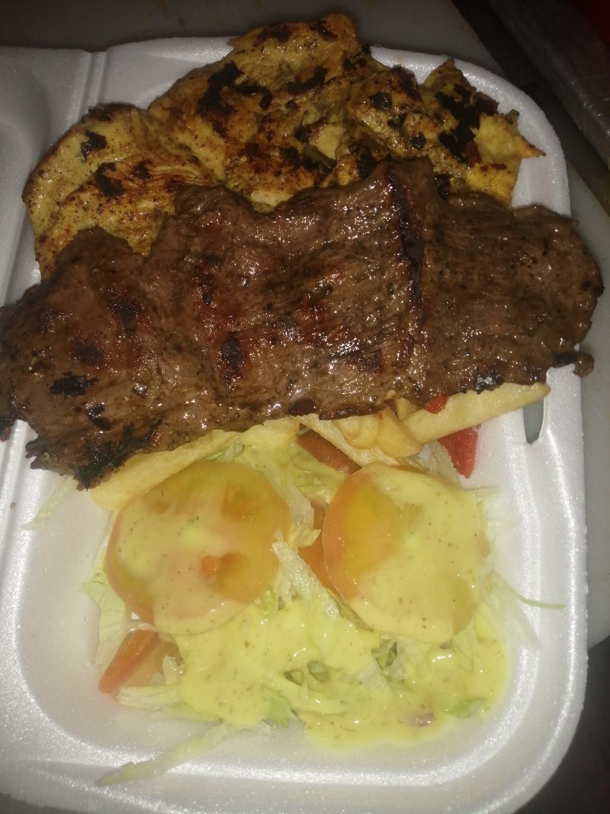 Carne de res asada, papas a la francesa ensalada de lechuga, salsa de la casa.