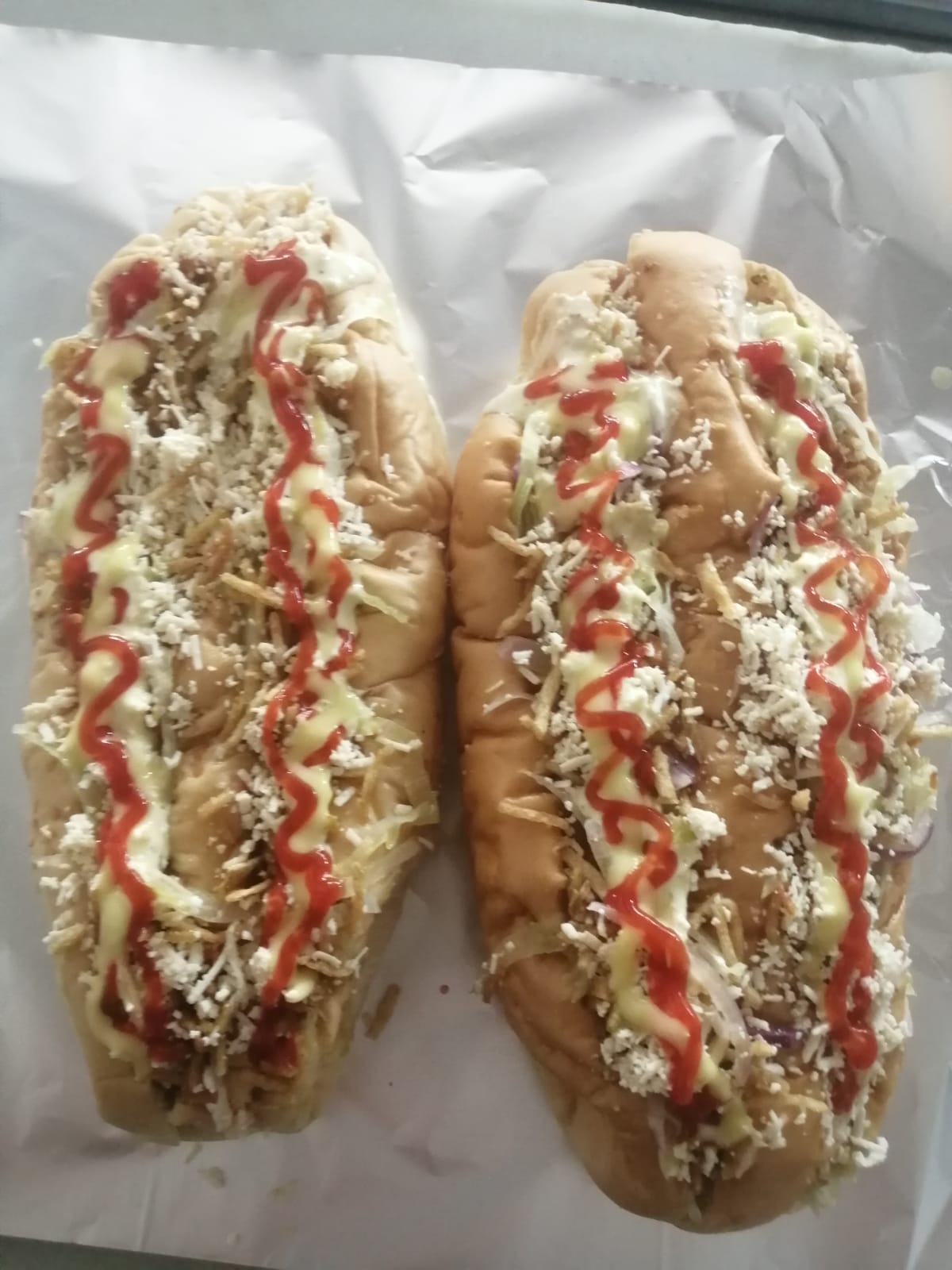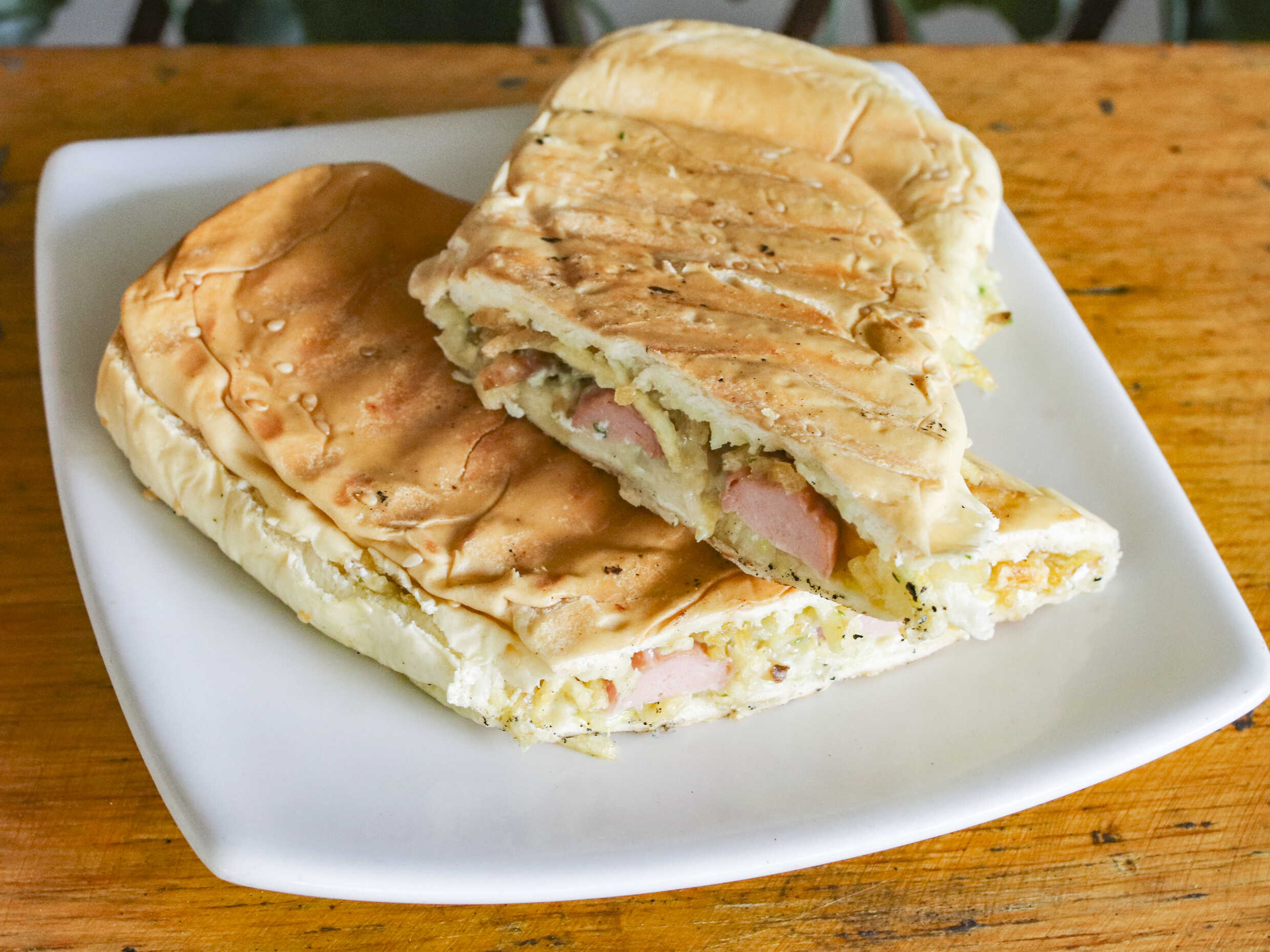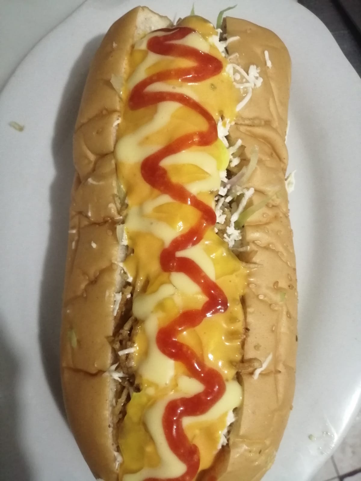 Ingredientes: pan de mantequilla, queso costeño, salchicha Suiza, jamón, queso mozzarella, salsa tartara y salsa de tomate,