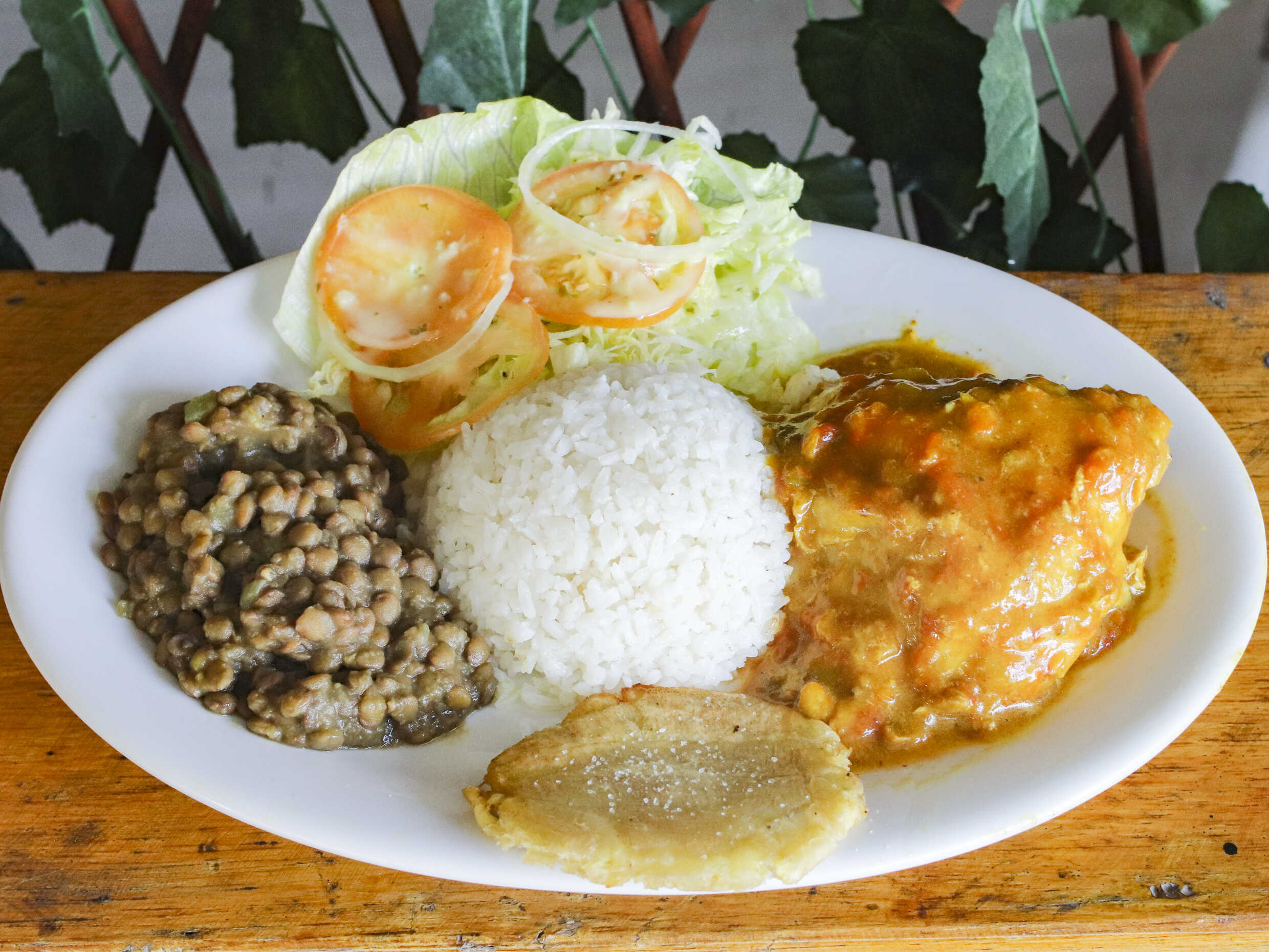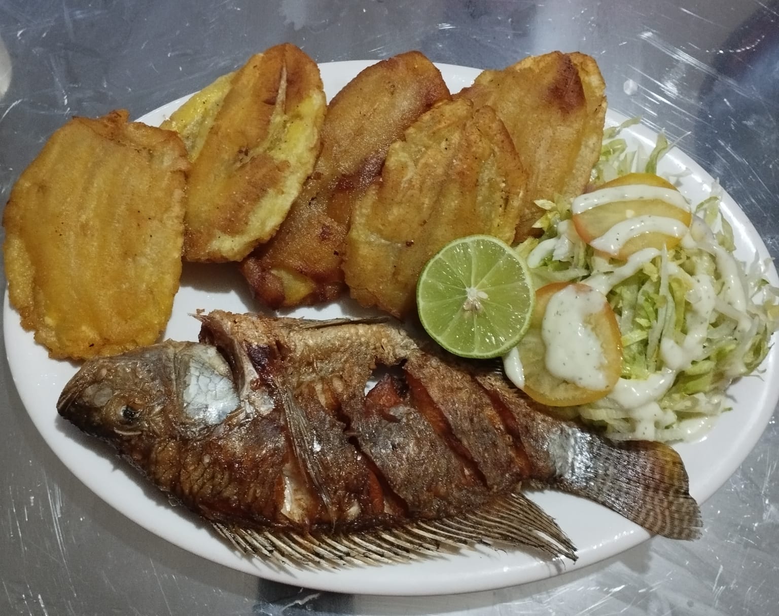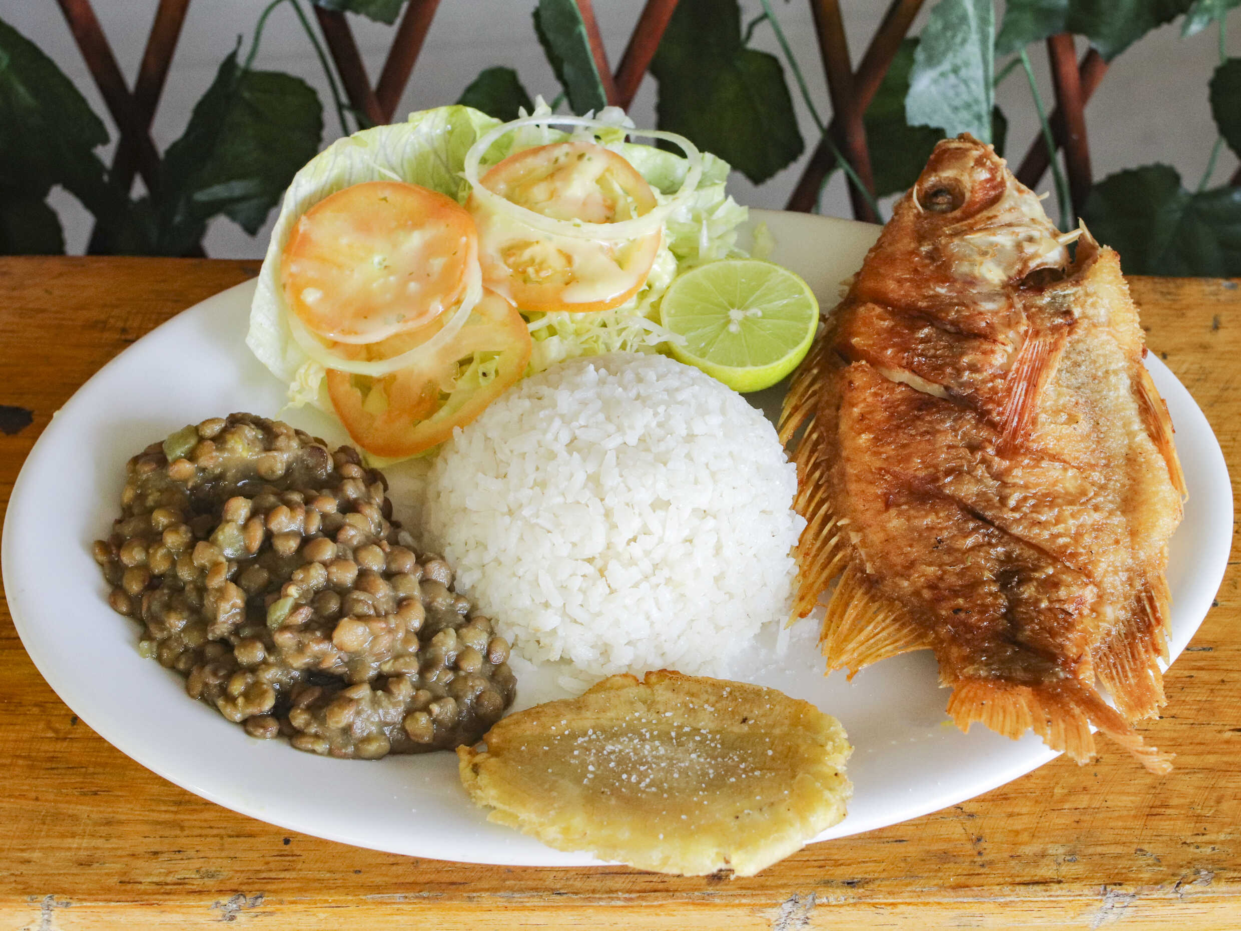 Mojarra frita, patacón y ensalada del día
