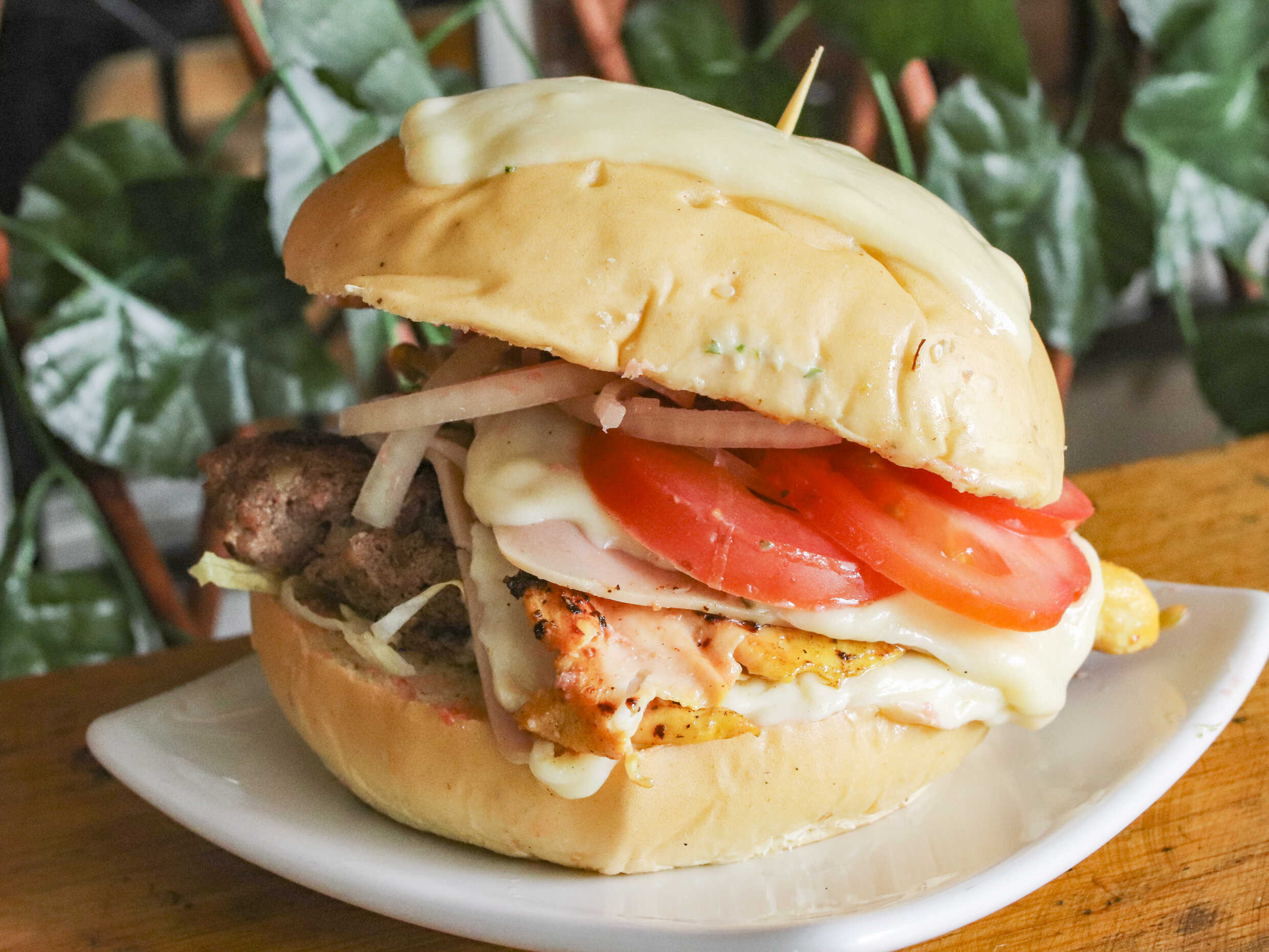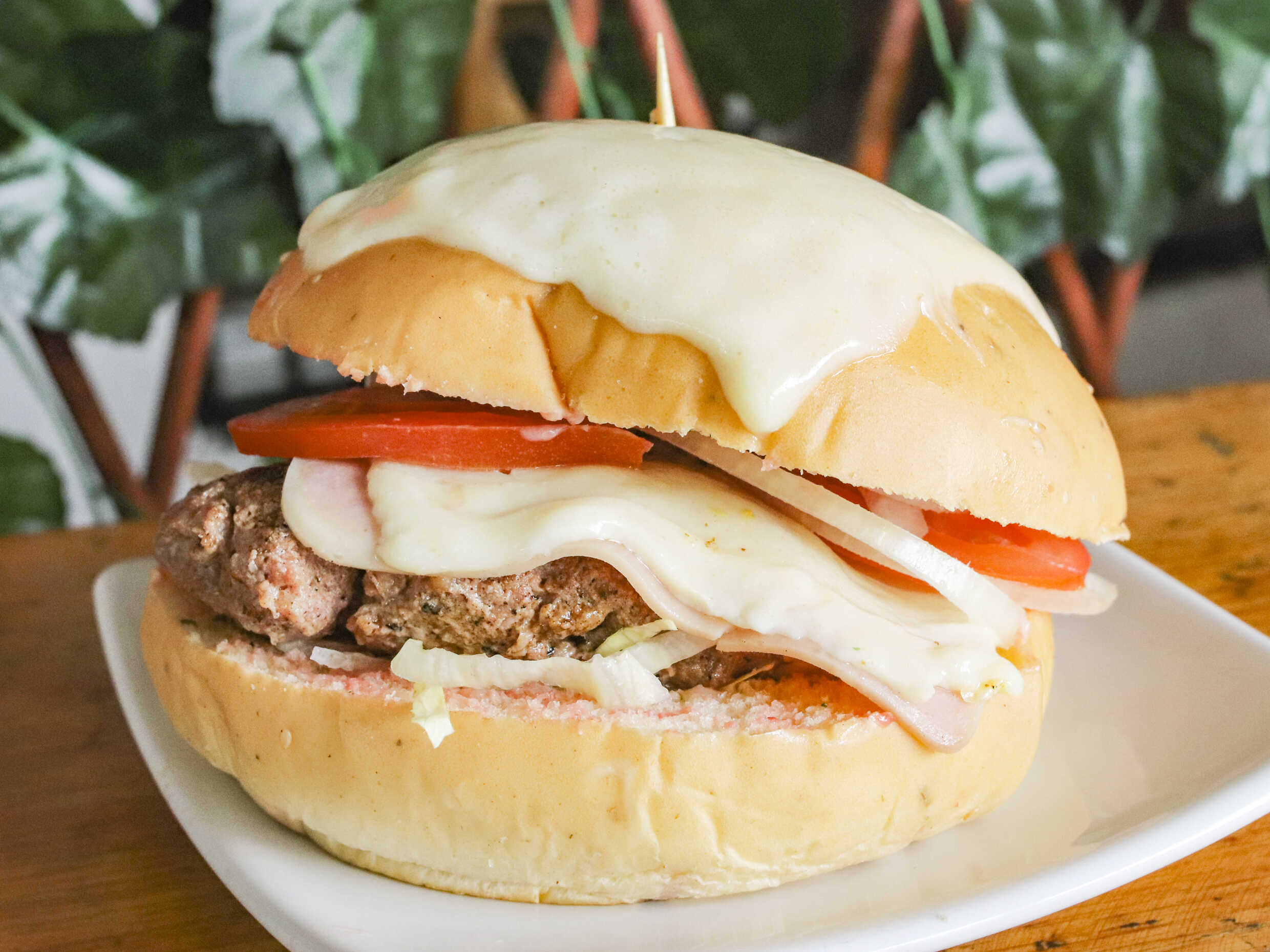 Pan de mantequilla, lechuga, queso mozzarella, jamón, doble carne, tomate, gratinada, salsa de la casa.