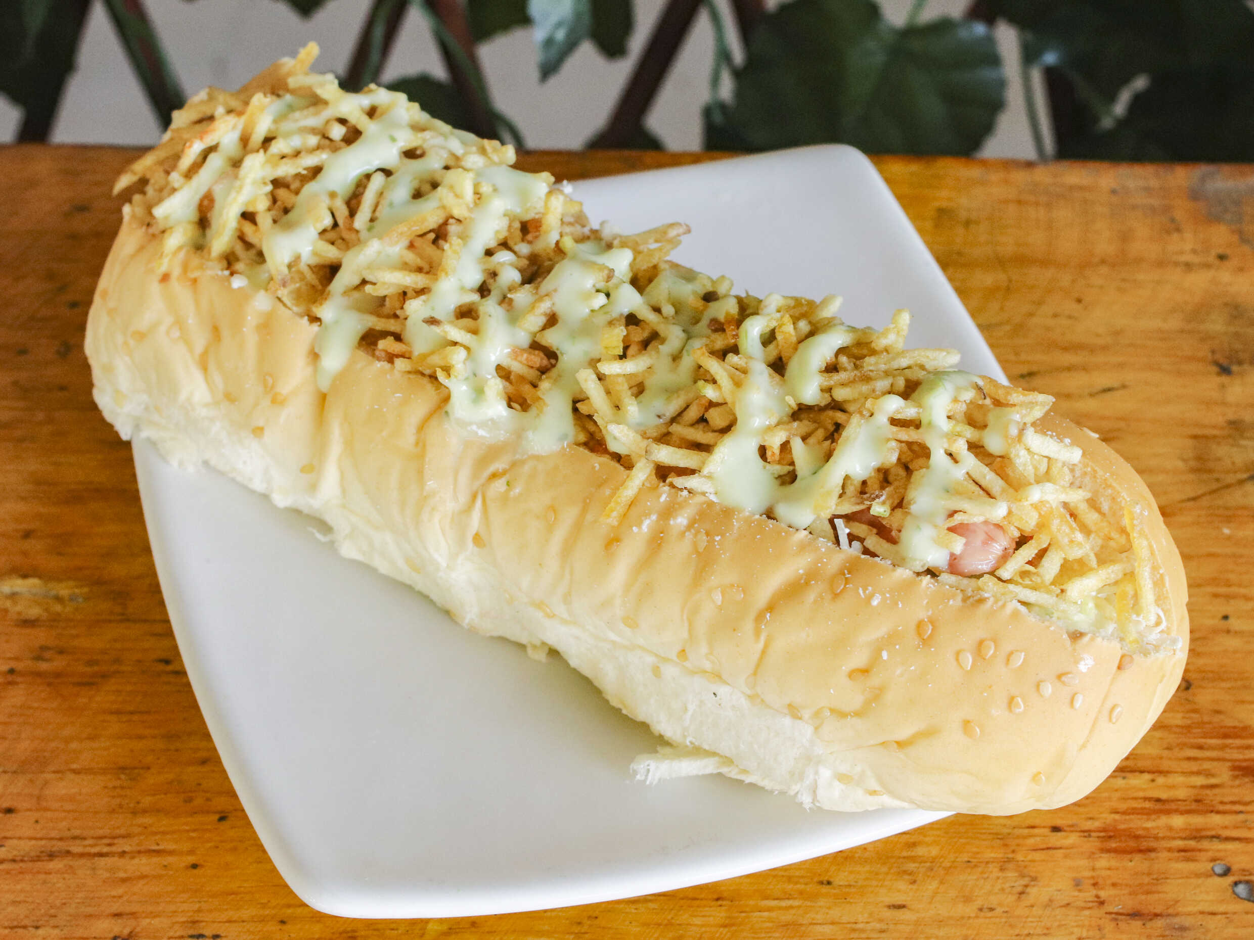 Pan de mantequilla, doble salchicha, lechuga, papa chongo, queso costeño, salsa de la casa.