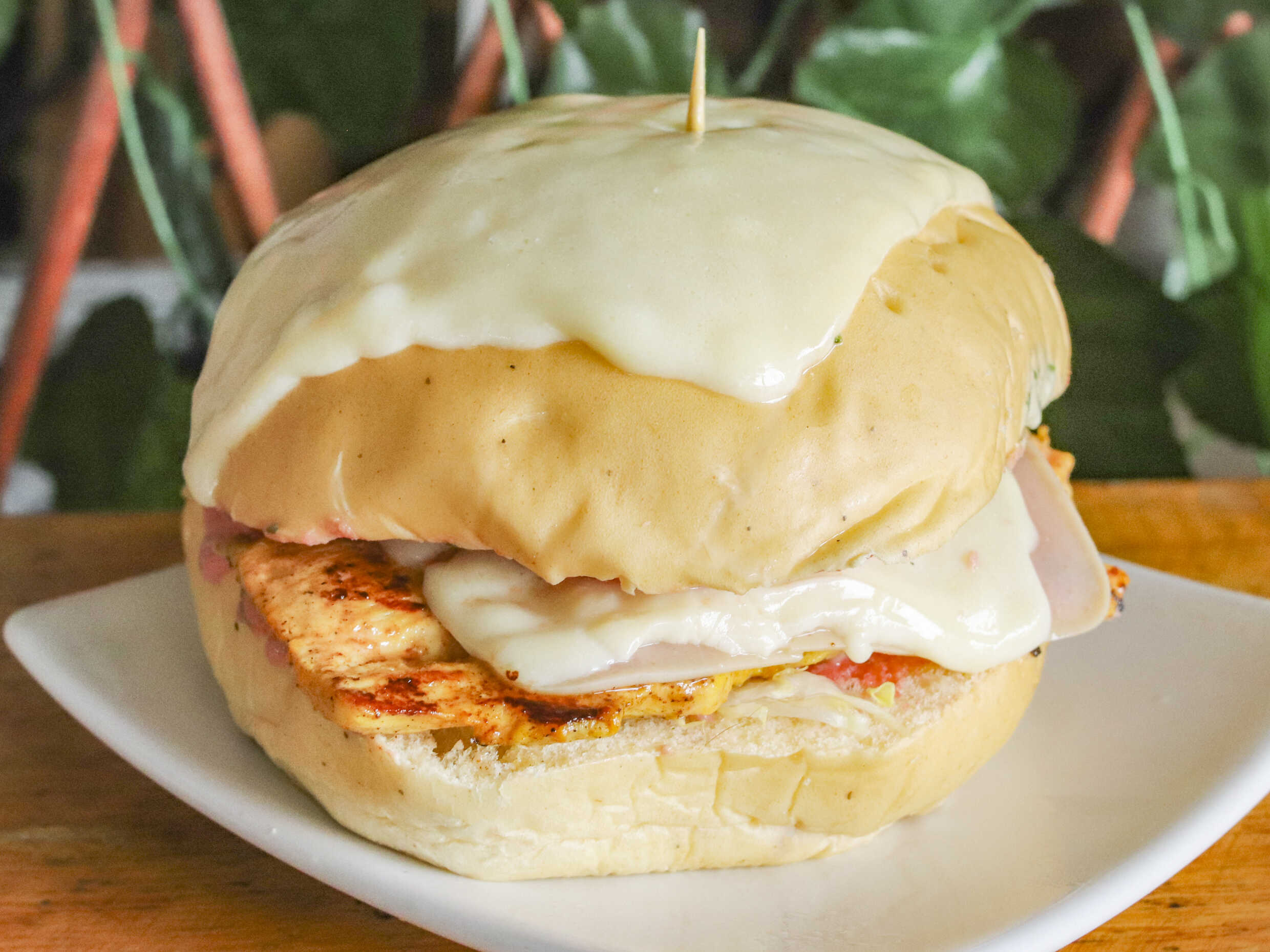 Pan de matequila, lechuga, queso mozzarella, jamón, pechuga de pollo, tomate, salsa de tomate, salsa de piña, salsa tartara.