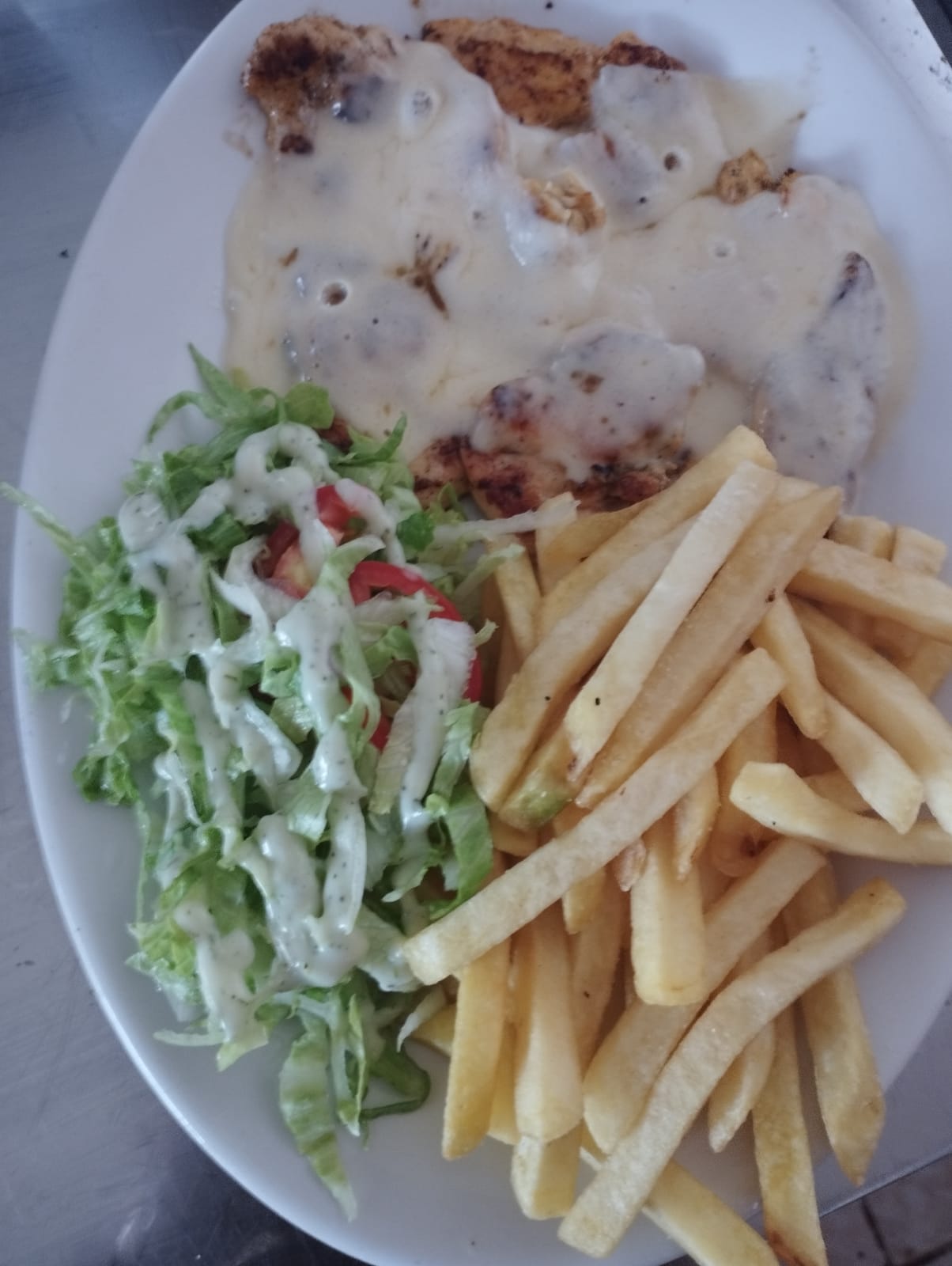 Pechuga de pollo, papas a la francesa o papa cocida, ensalada vee salsa de la casa.