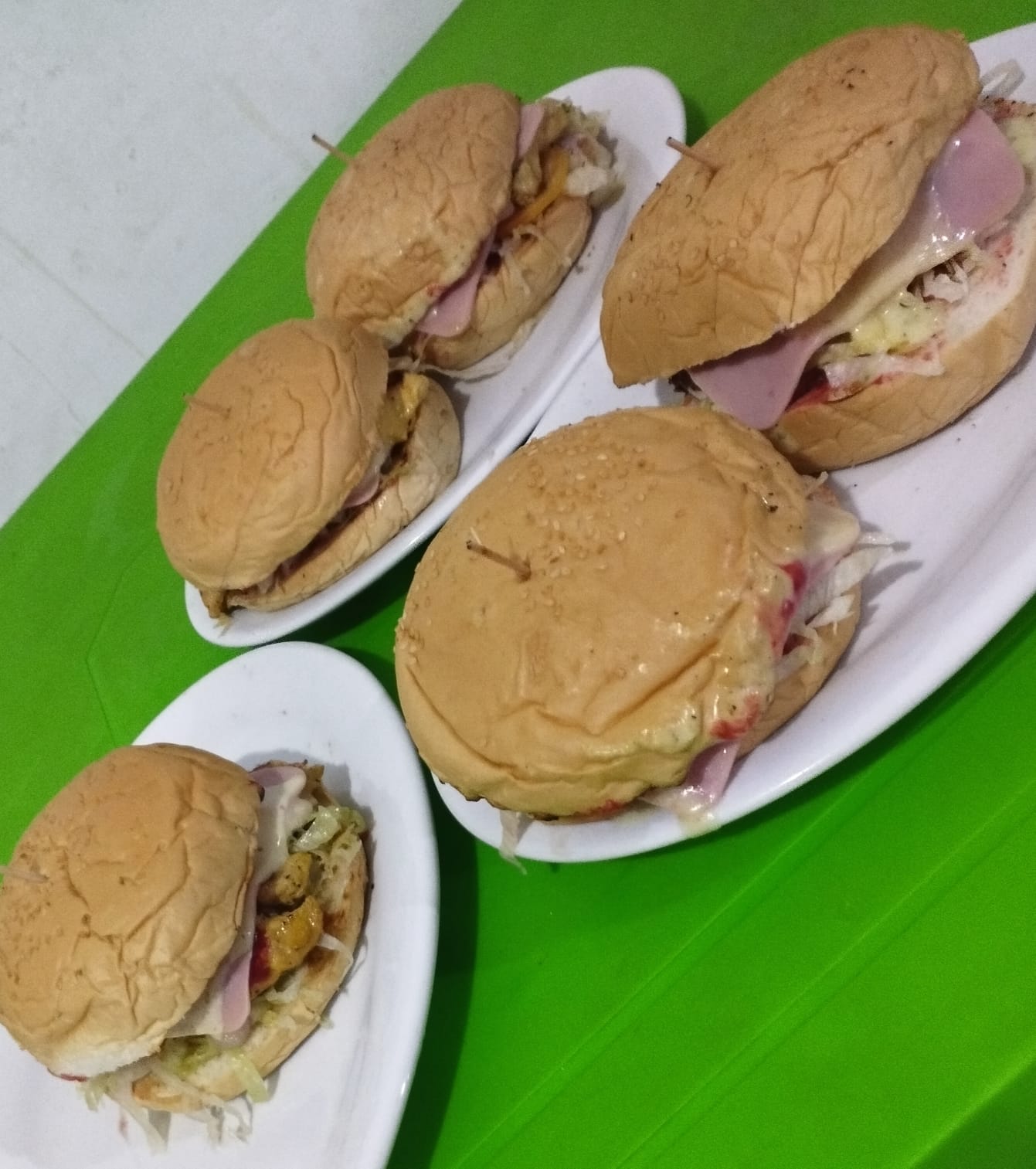 Pan de mantequilla, lechuga, queso mozzarella, jamón, carne de res, pechuga, tomate, salsa e tomate, salsa de piña salsa tartara