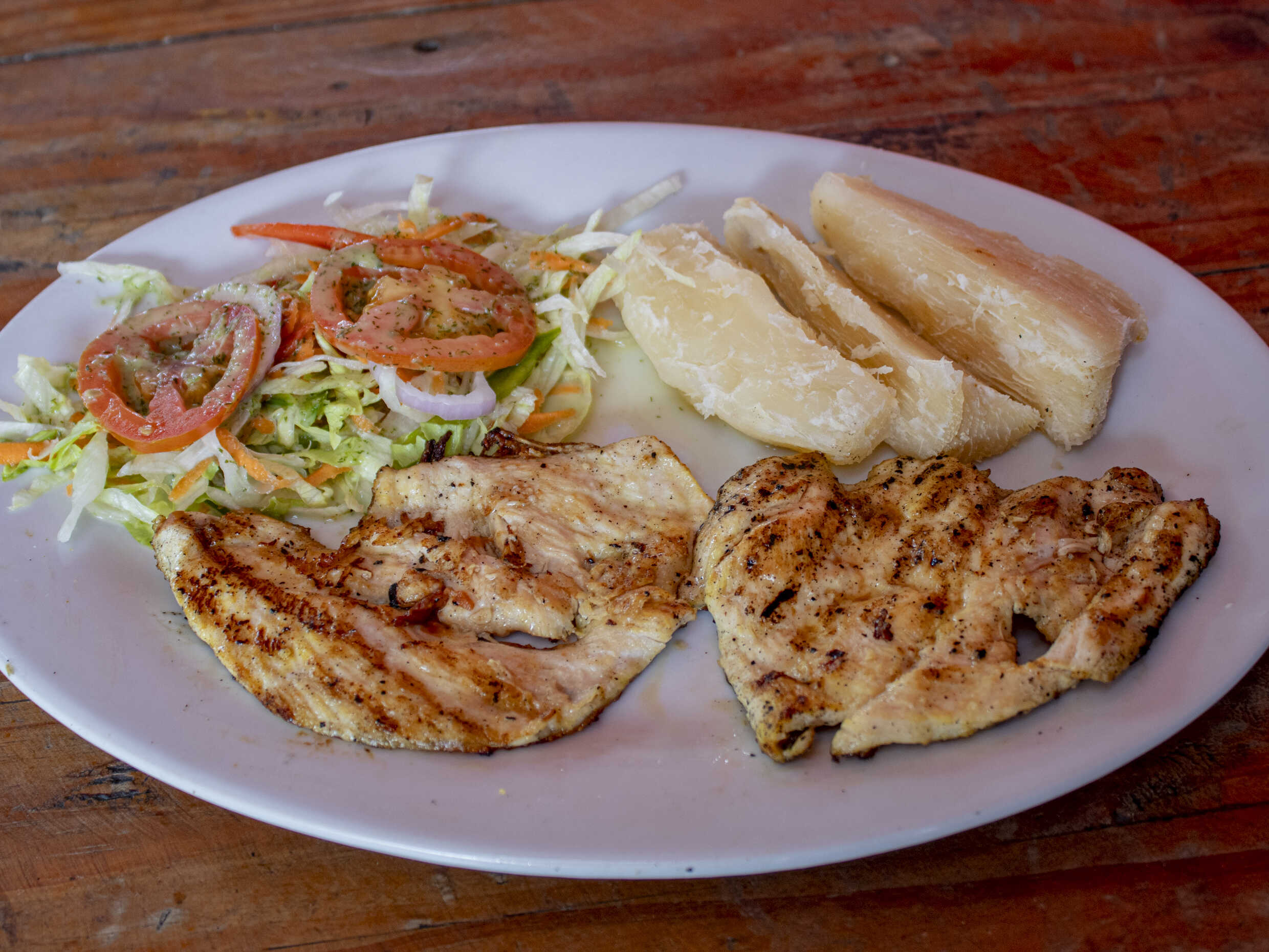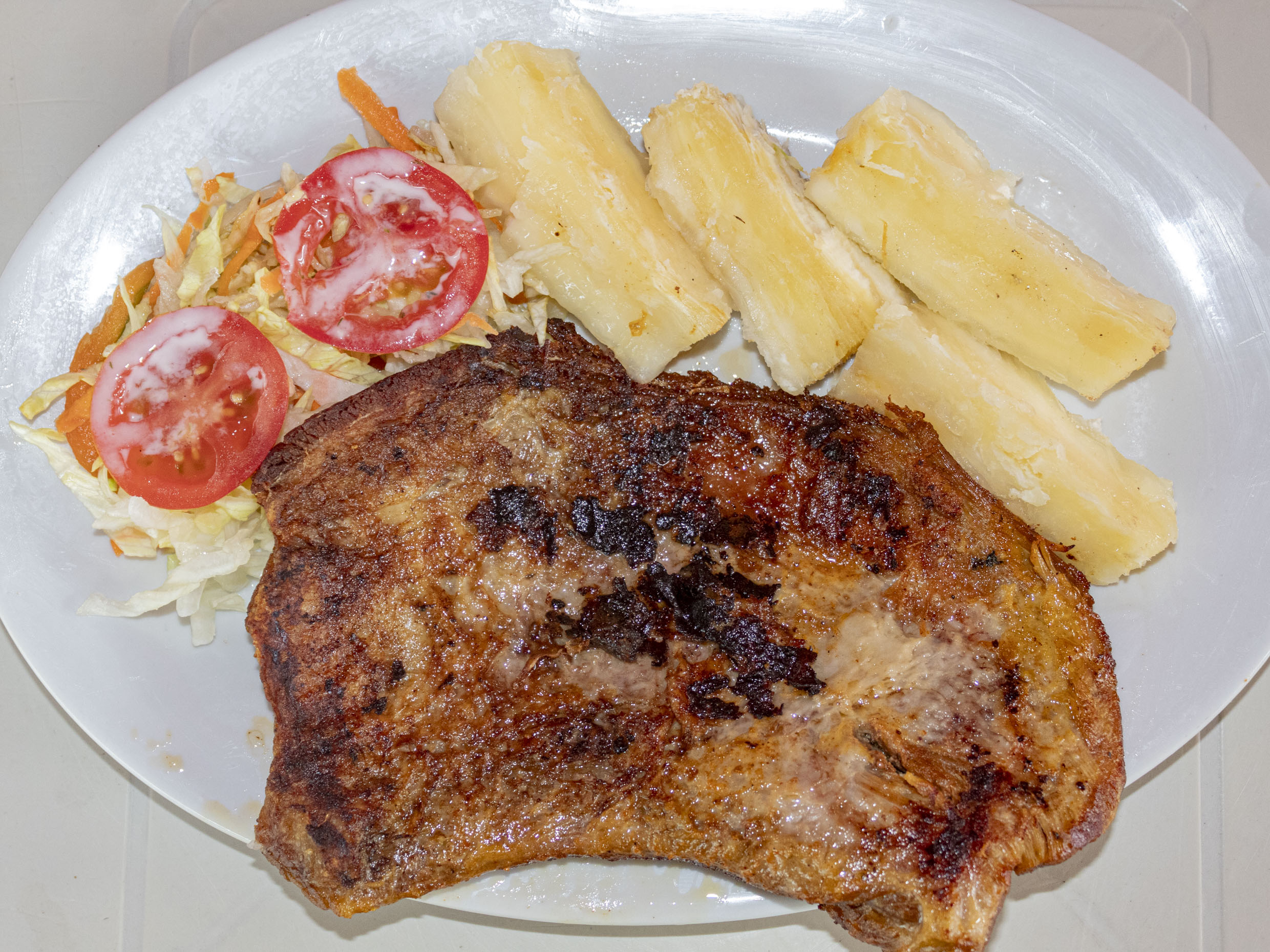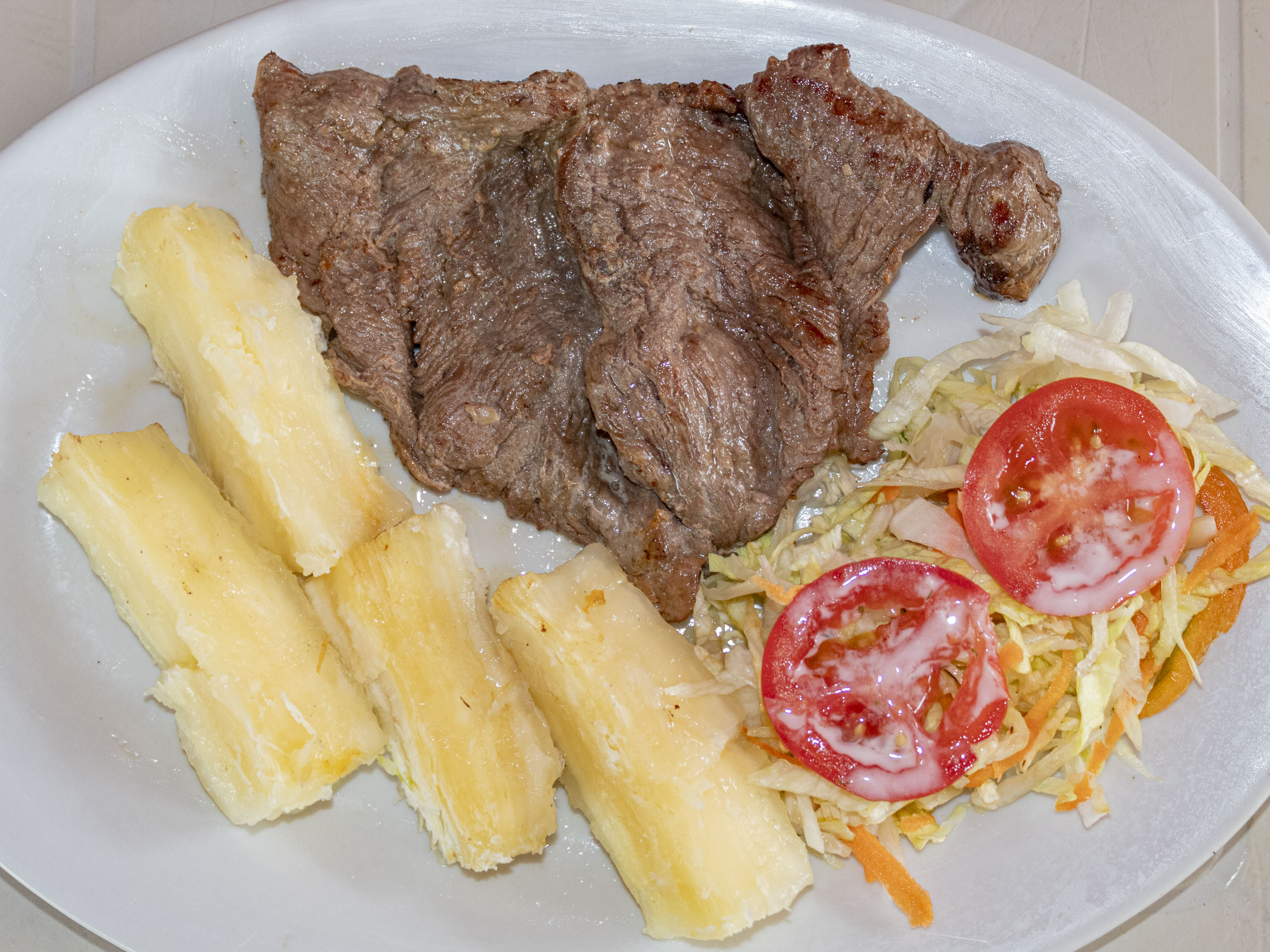 Porción de carné asada (Tetafula), acompañado de una porción de yuca, ensalada de lechuga con tomate y cebolla.