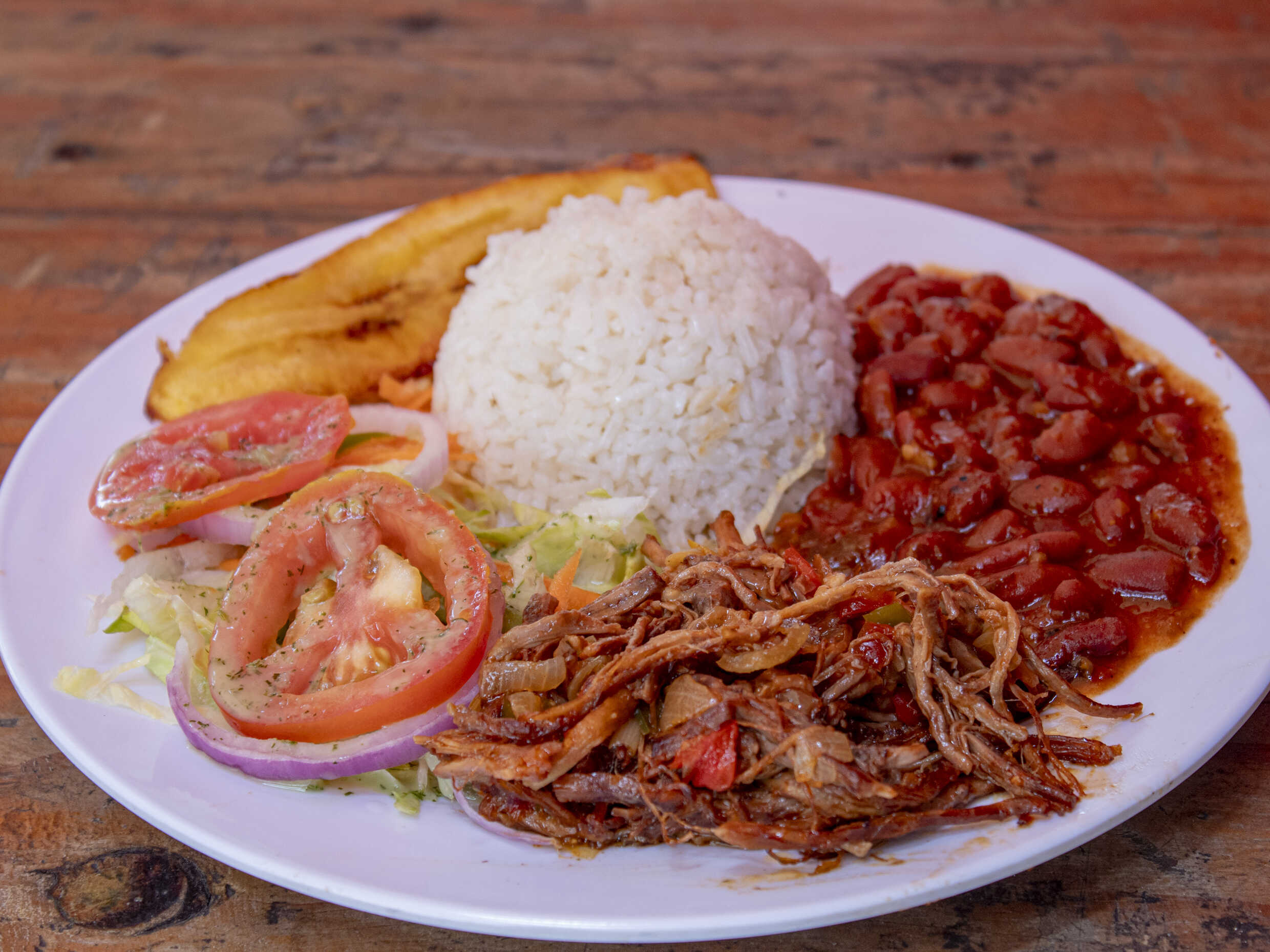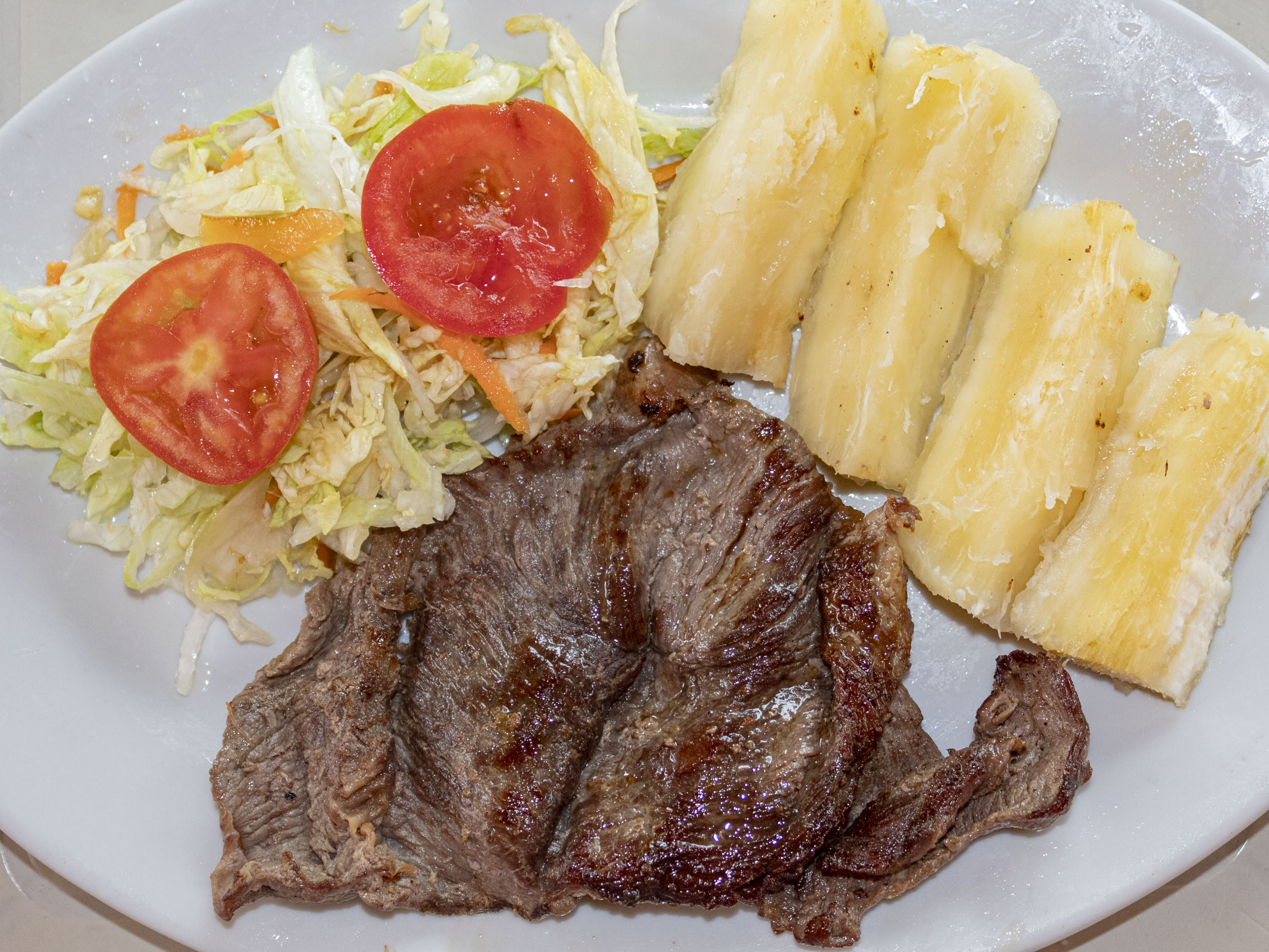 Porción de carné punta gorda, acompañado de una porción de yuca, ensalada de lechuga con tomate y cebolla.