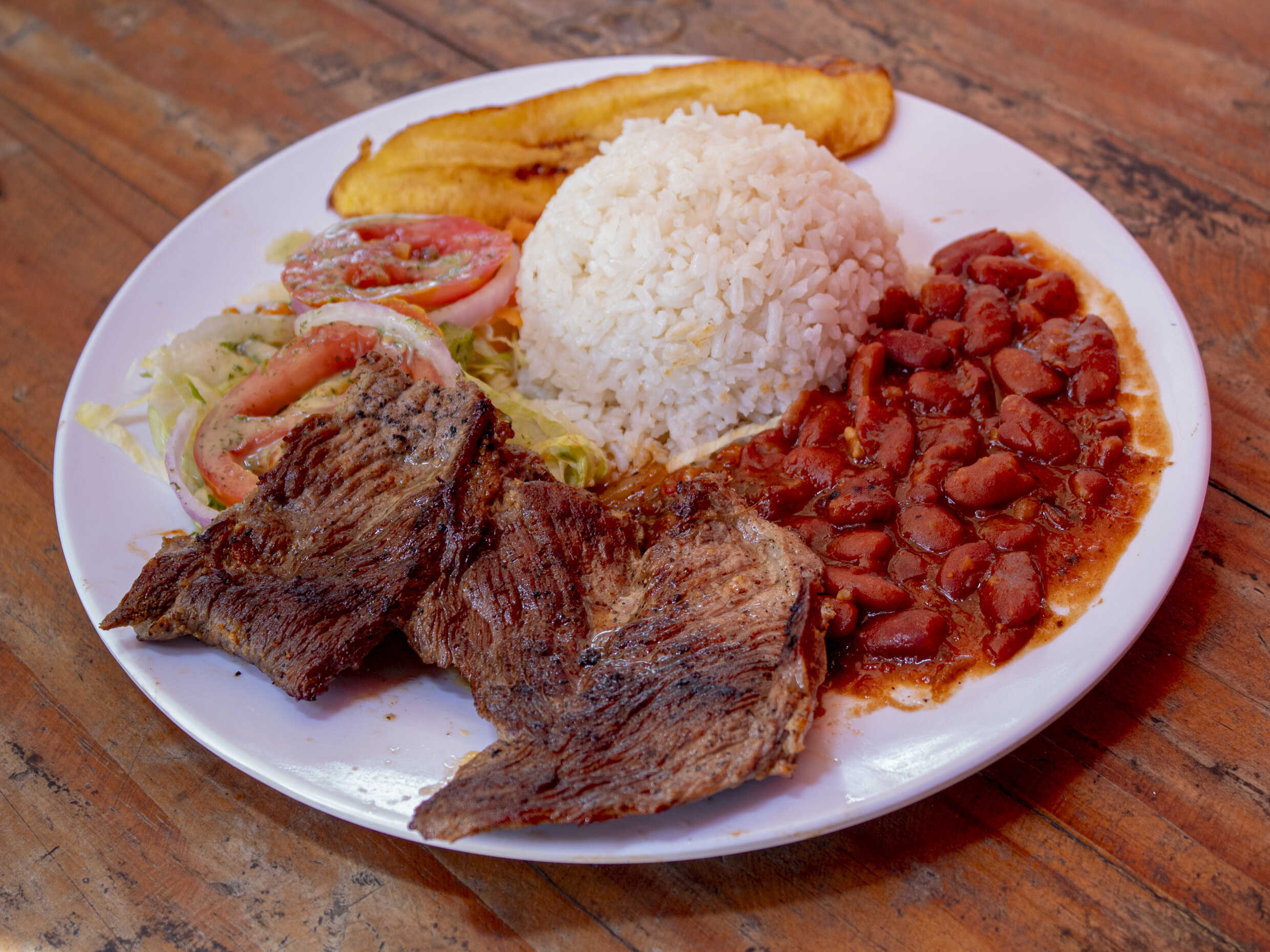 Porción de carne en bistec, acompañada de unas deliciosas sopas, porción de arroz, granos o pastas, tajada madura y ensalada de la casa.