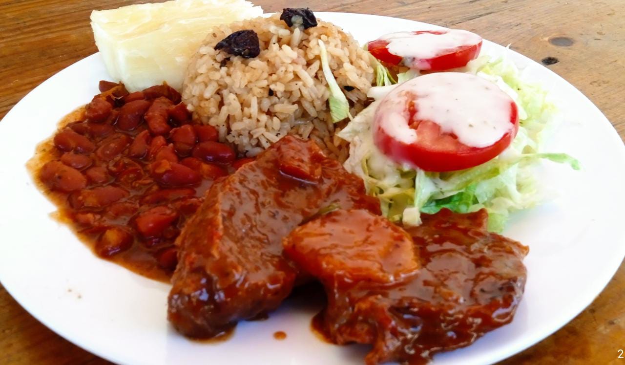 Lengua en Salsa de Ciruela, Acompañada de unas deliciosas sopas, Arroz de coco, Ensalada de la casa y yuca cocida.