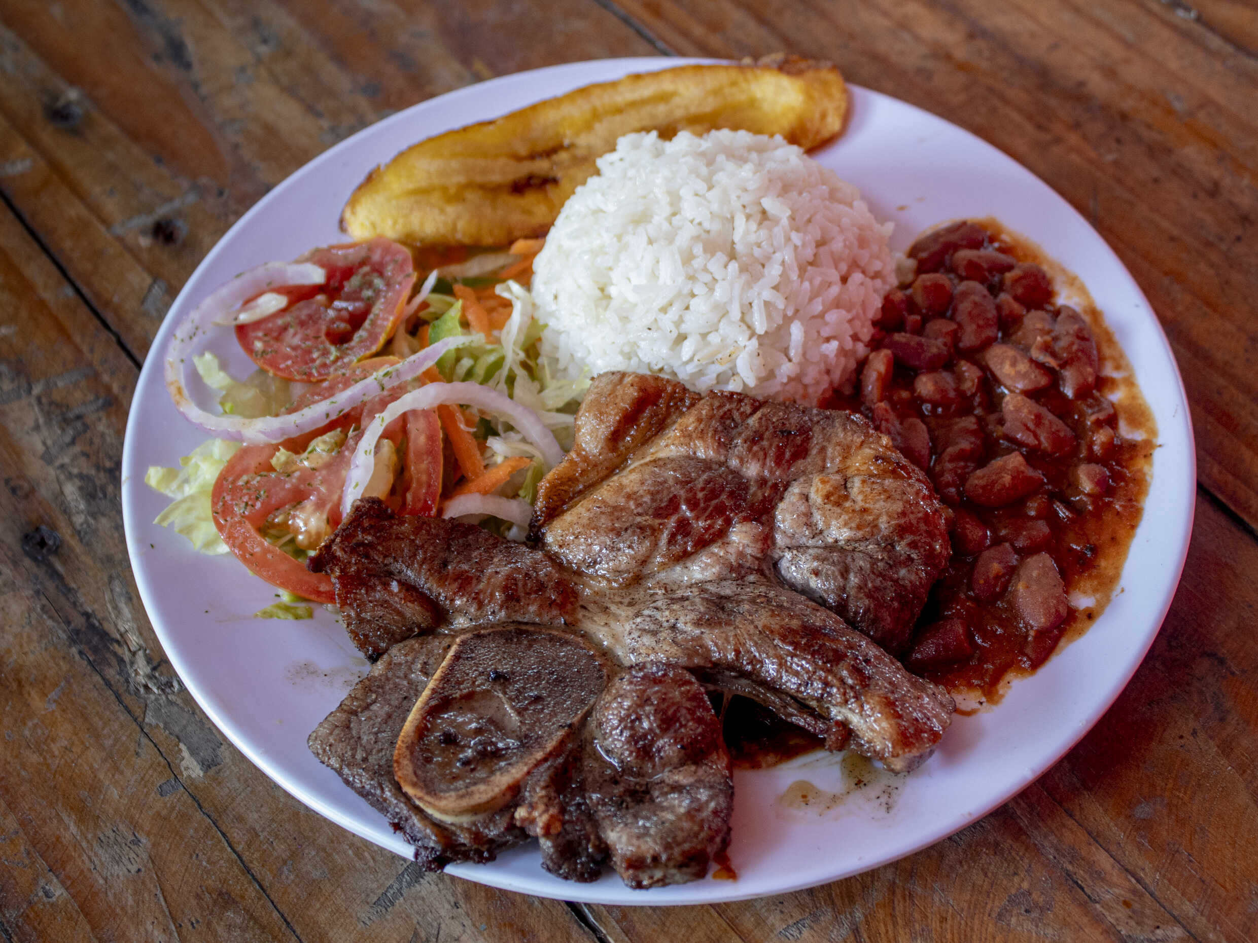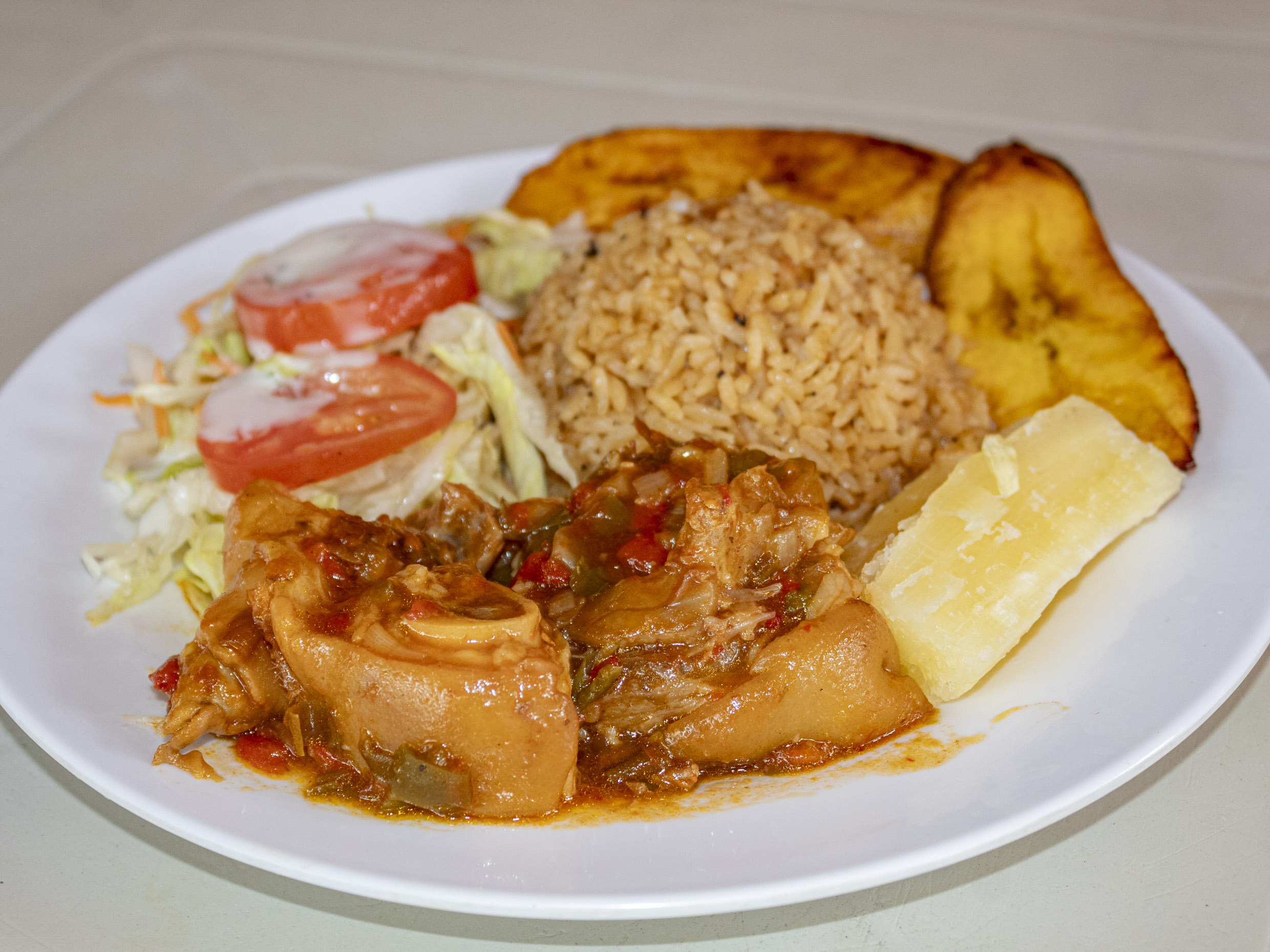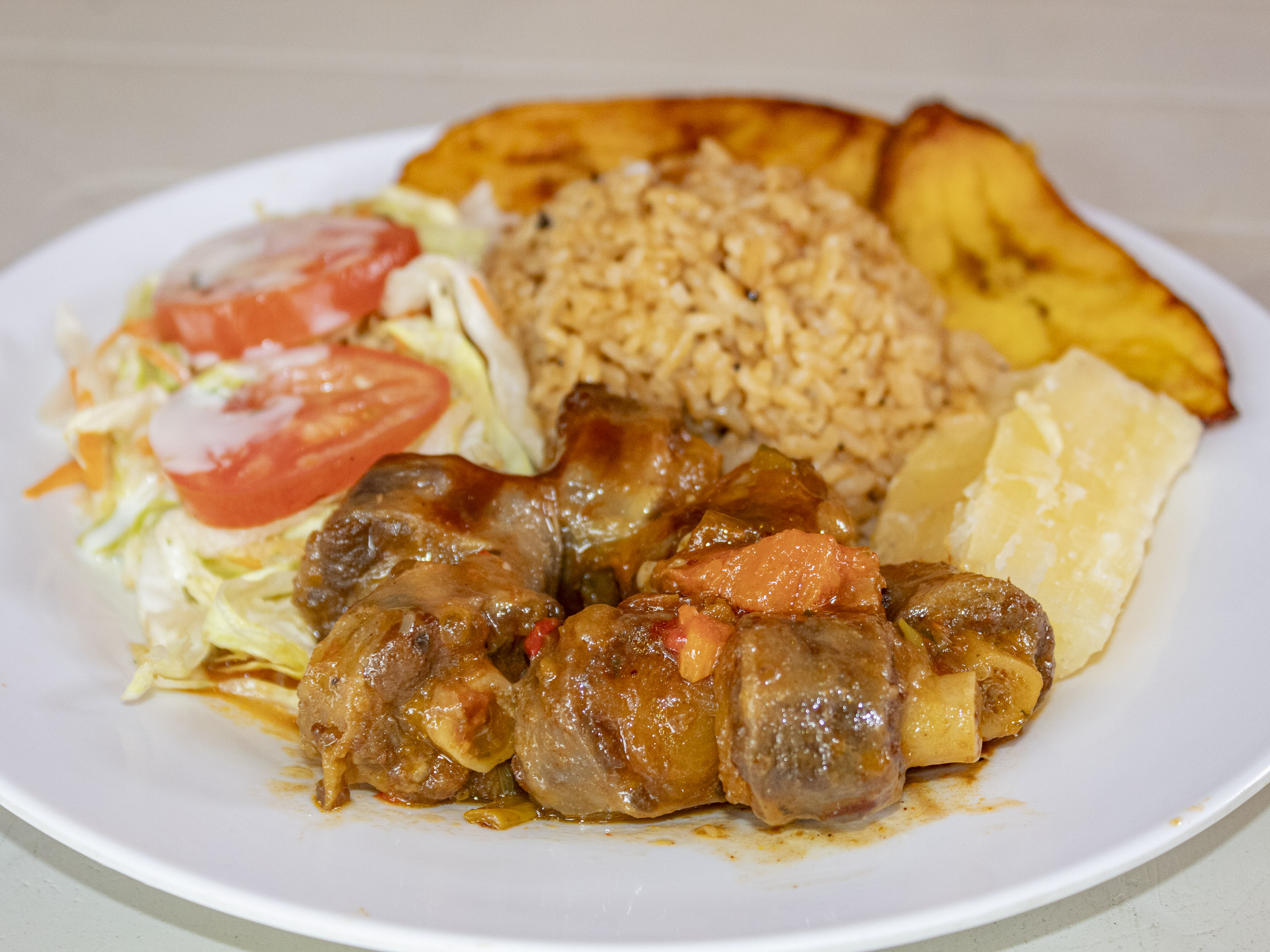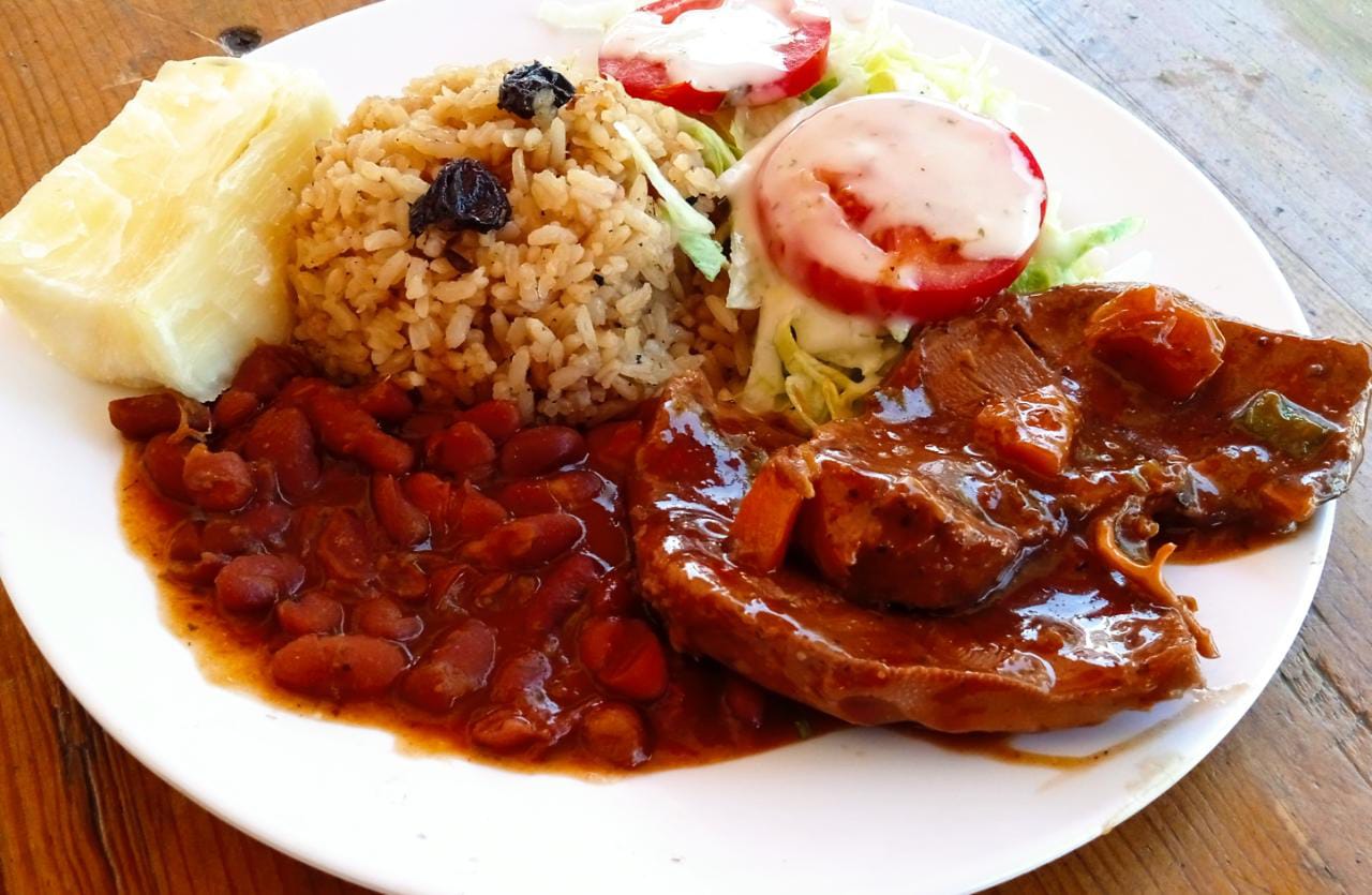 Rabo de res guisado, acompañado de unas deliciosas sopas, arroz, granos, ensalada y tajada de plátanos maduros.