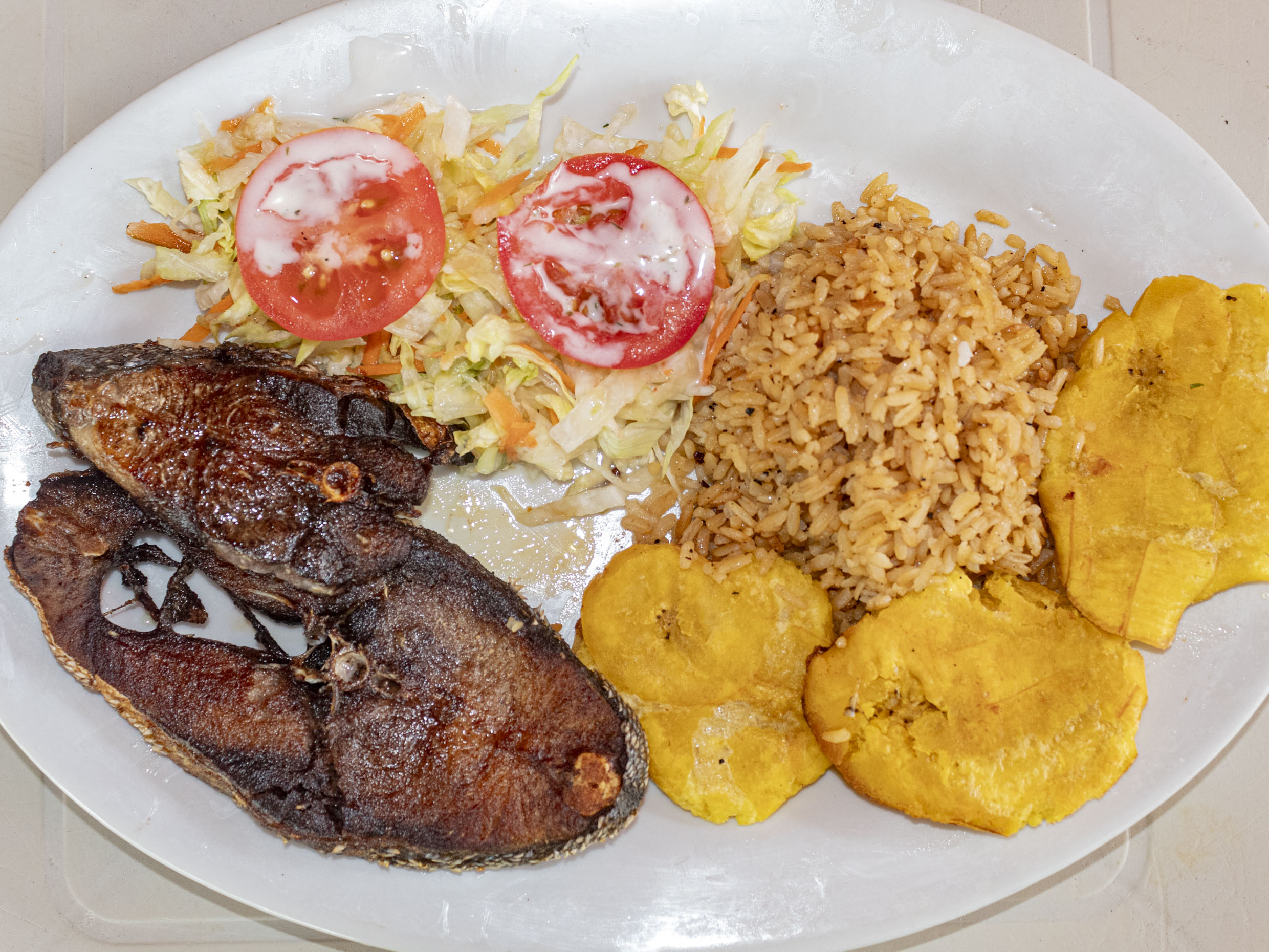 Sobre barriga, acompañada de unas deliciosas sopas con arroz de coco , ensalada y yuca cocida.
