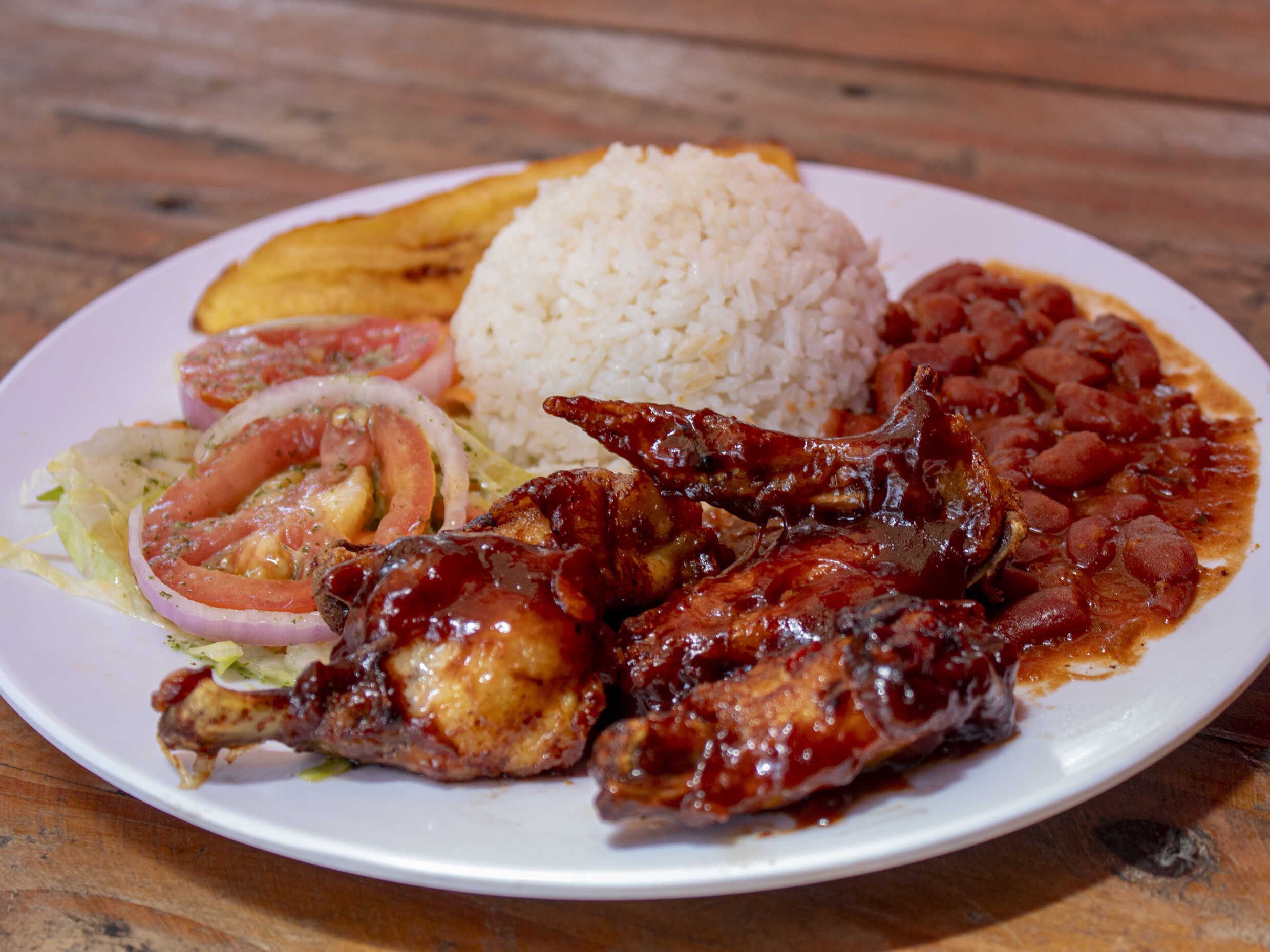 Alitas de pollo cocidas y fritas, salteadas en una deliciosa salsa BBQ, acompañada de una ricas sopas, arroz, granos, ensalada y tajadas maduras.