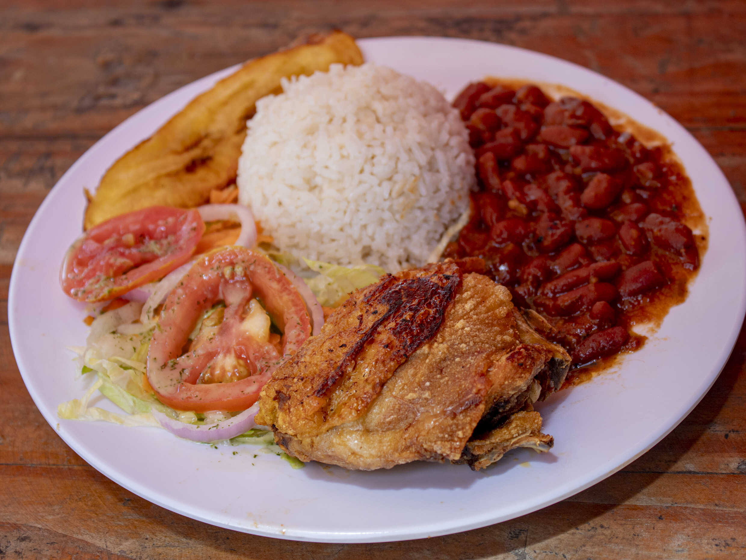 Porción de carne frita, acompañada de unas deliciosas sopas, porción de arroz, granos o pastas, tajada madura y ensalada de la casa.