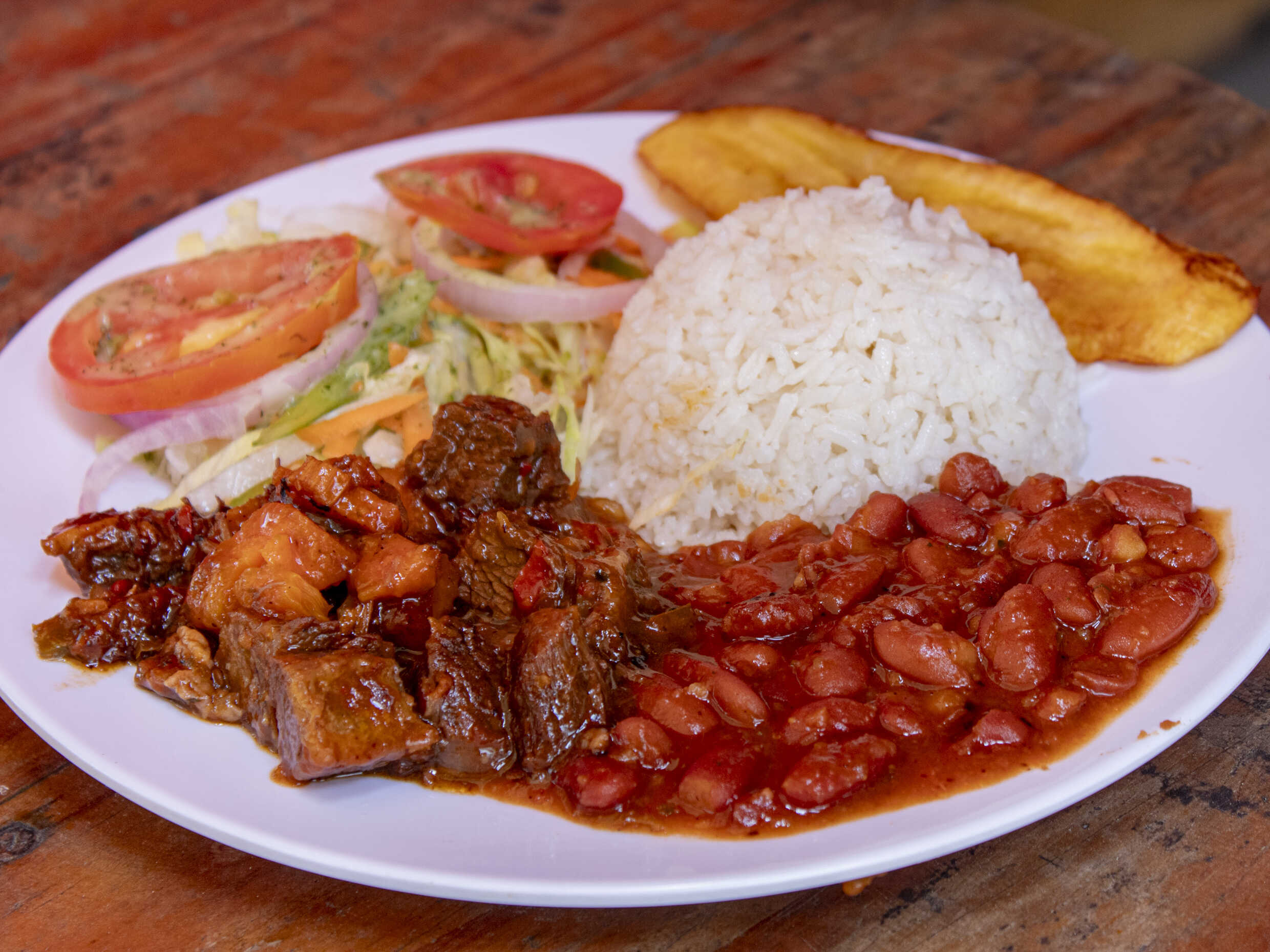 Porción de carne guisada, acompañada de unas deliciosas sopas, porción de arroz, granos o pastas, tajada madura y ensalada de la casa.