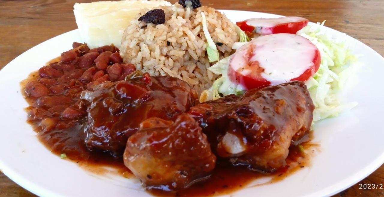 Costillitas de Cerdo salteadas en una deliciosa Salsa BBQ, acompañada de una deliciosa Sopas, Arroz de Coco, Ensalada y Yuca cocida.