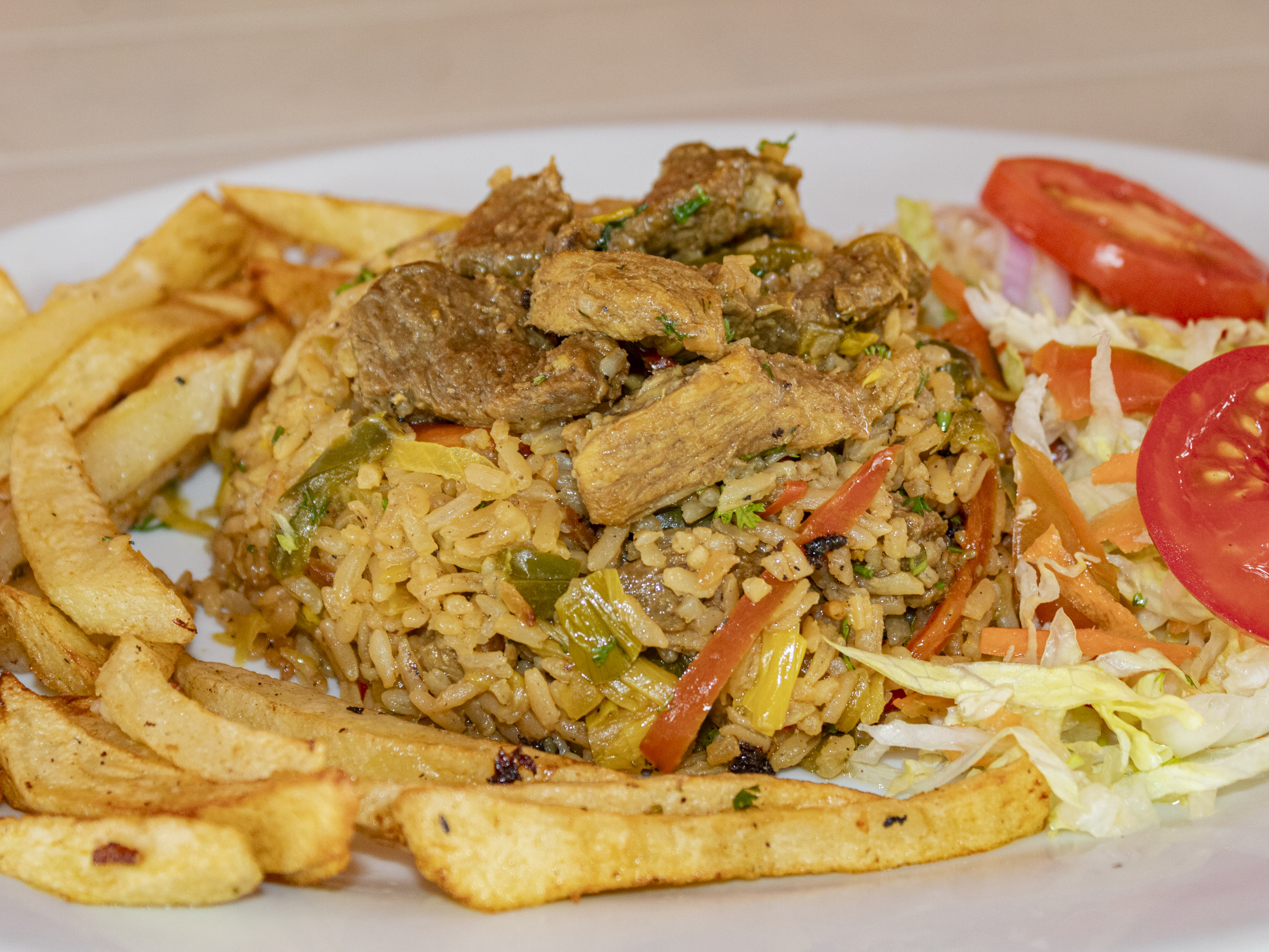 Arroz, verduras, tocino de cerdo, trocitos de carne y papas francesas