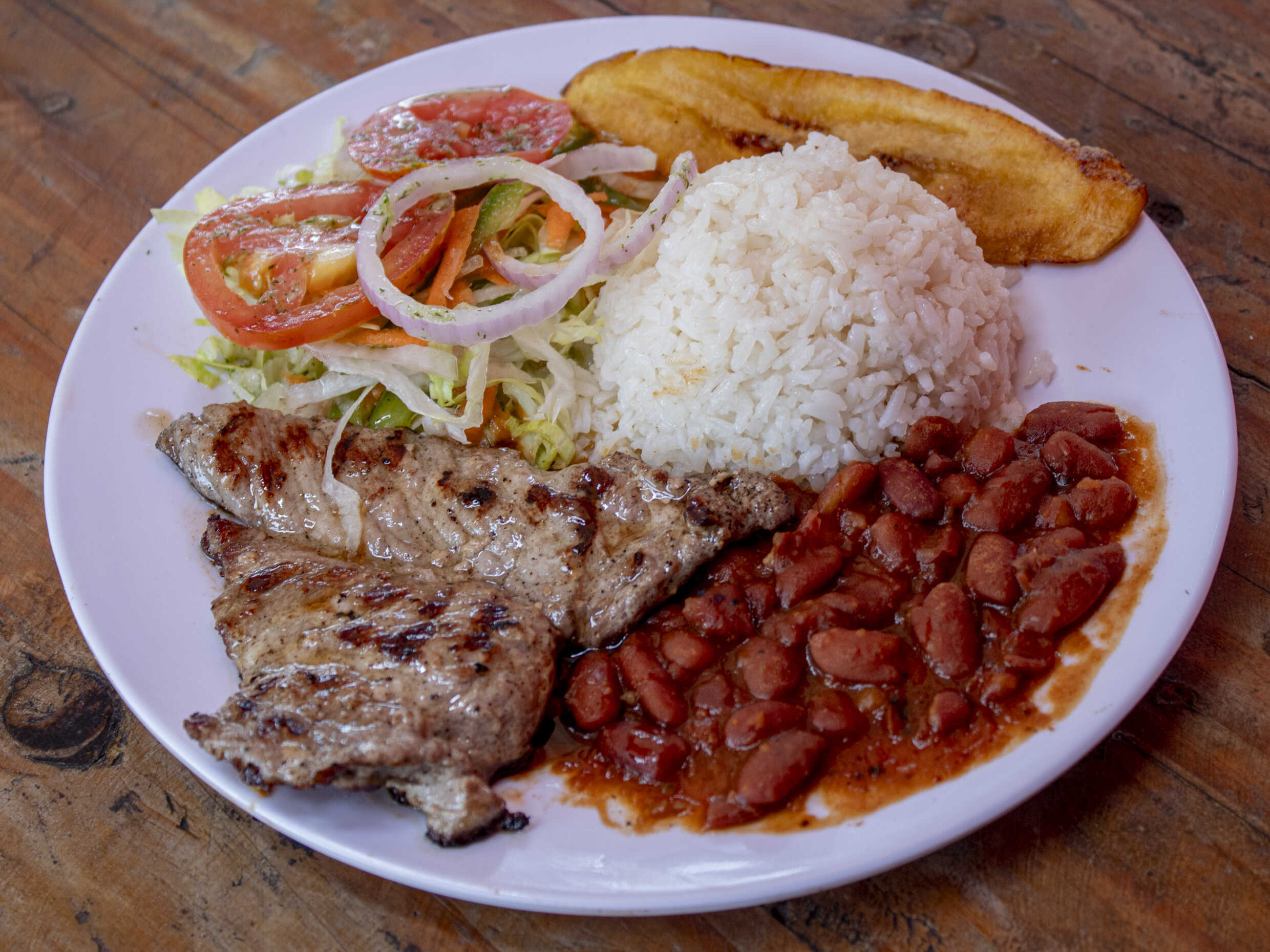 Porción de lomito de cerdo, acompañada de unas deliciosas sopas, porción de arroz, granos o pastas, tajada madura y ensalada de la casa.