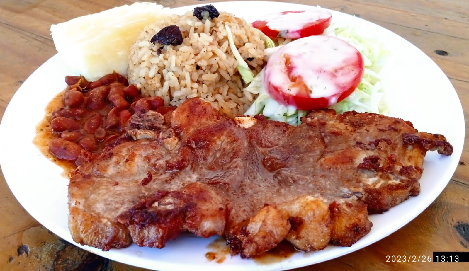 Porción de lomo de cerdo asado, acompañado de una porción de yuca, ensalada de lechuga con tomate y cebolla.