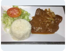 130 g De lomo de cerdo, acompañado de papas francesas y ensalada verde.