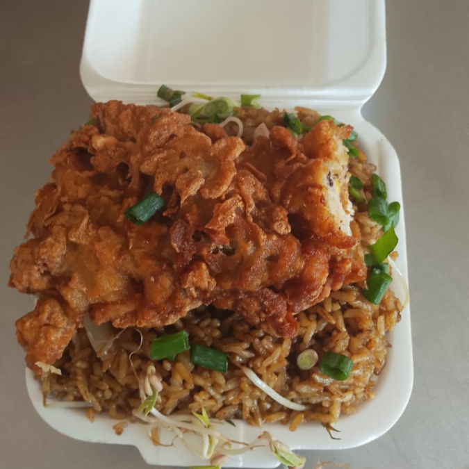 Porción personal: Saborea nuestro irresistible arroz salteado al wok, preparado con una mezcla perfecta de cerdo jugoso, pollo tierno y camarones frescos, todo con ese toque oriental. en contenedor C1
