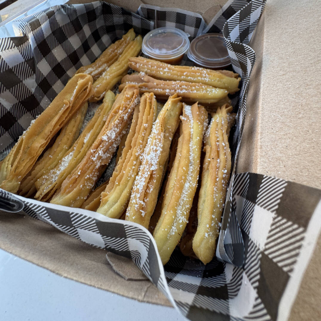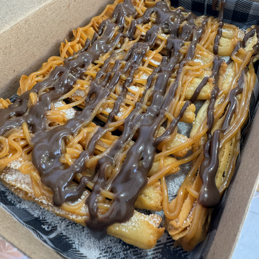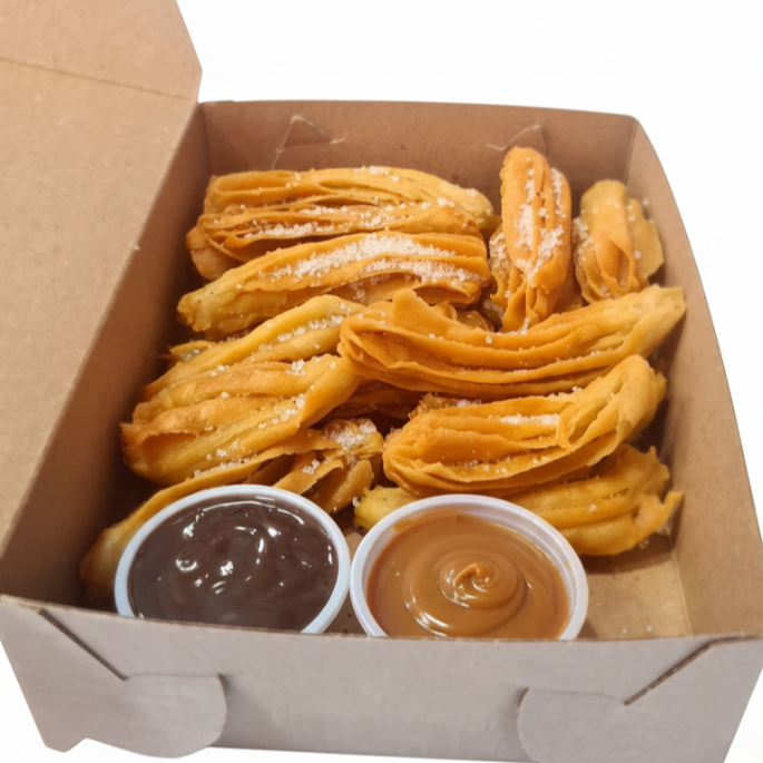 100 churros artesanales recién fritos, crujientes por fuera y suaves por dentro. Espolvoreados en azúcar y listos para disfrutar. Incluye 5 salsas clásica a elección (arequipe o chocolate)