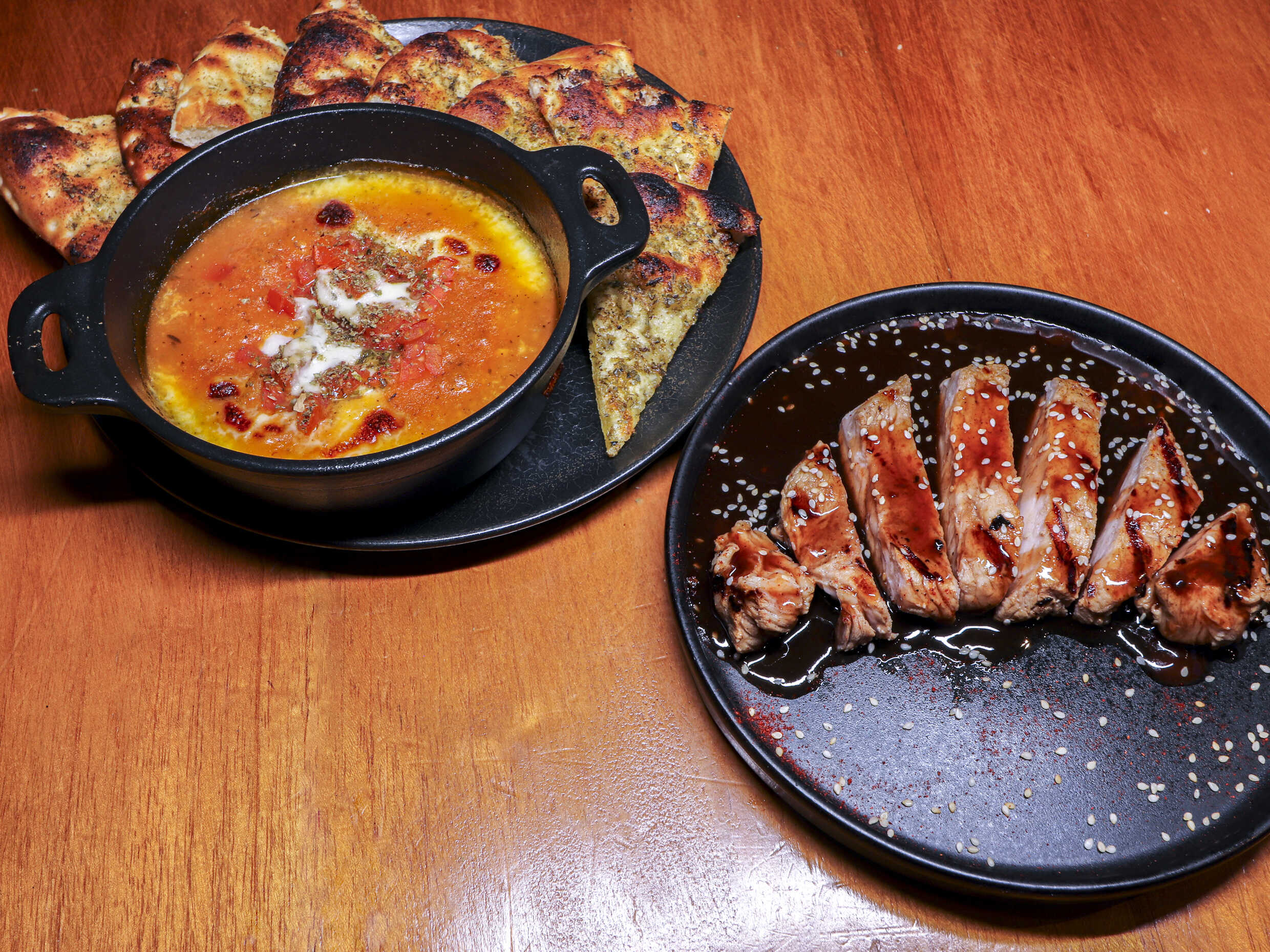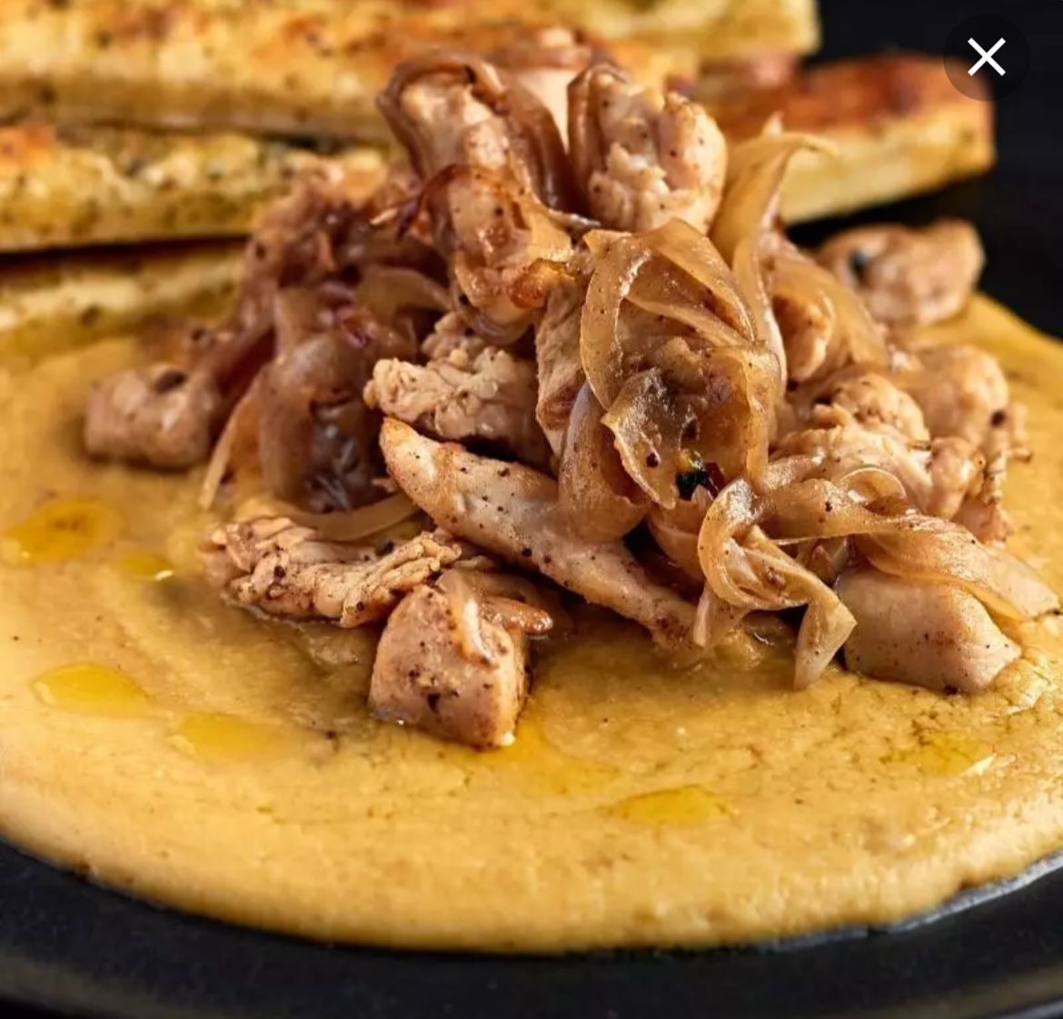 Pollo Salteado en aceite de oliva con cebollas en juliana, sobre un tahine especial a base de tomillo y romero fresco. Acompañado de palitos de pan provenzal.