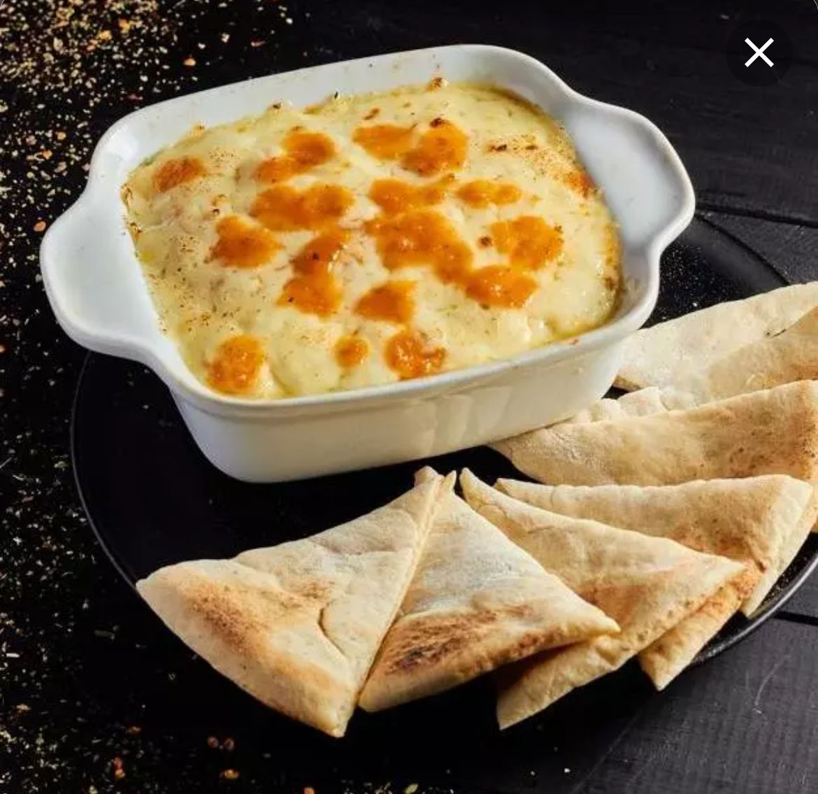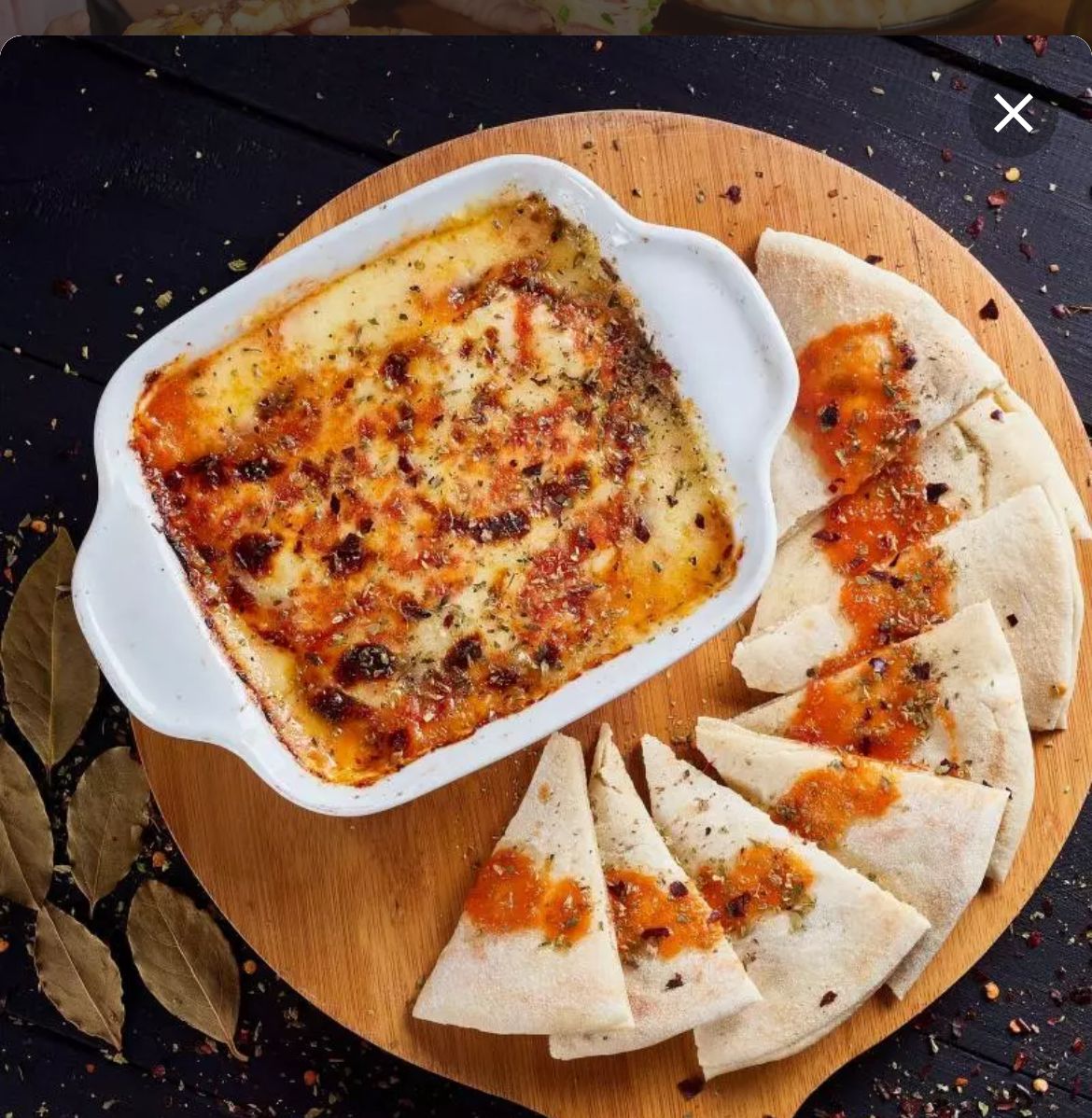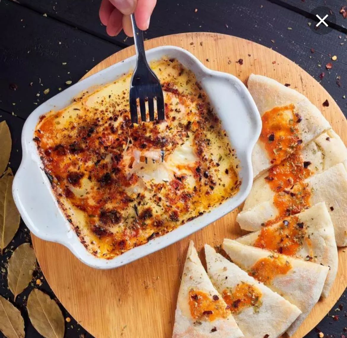 En horno de piedras con doble capa de queso, acompañado en pan tipo árabe y gratinada en salsa blanca