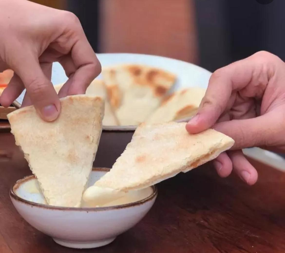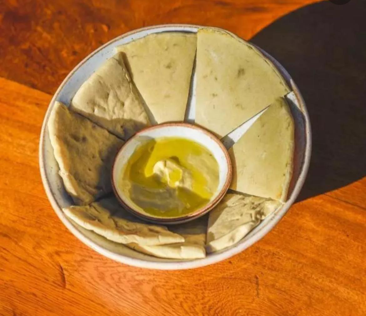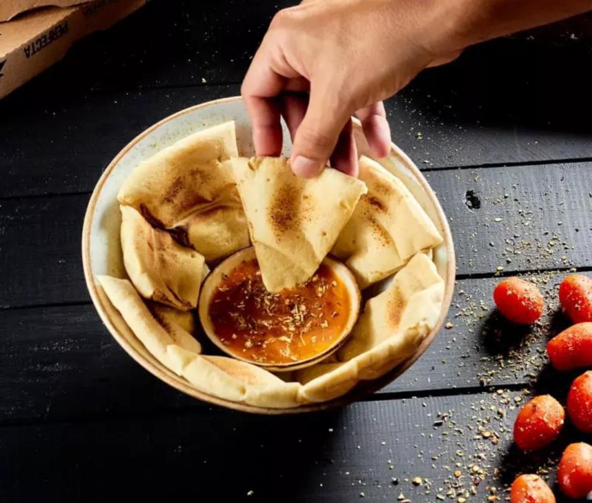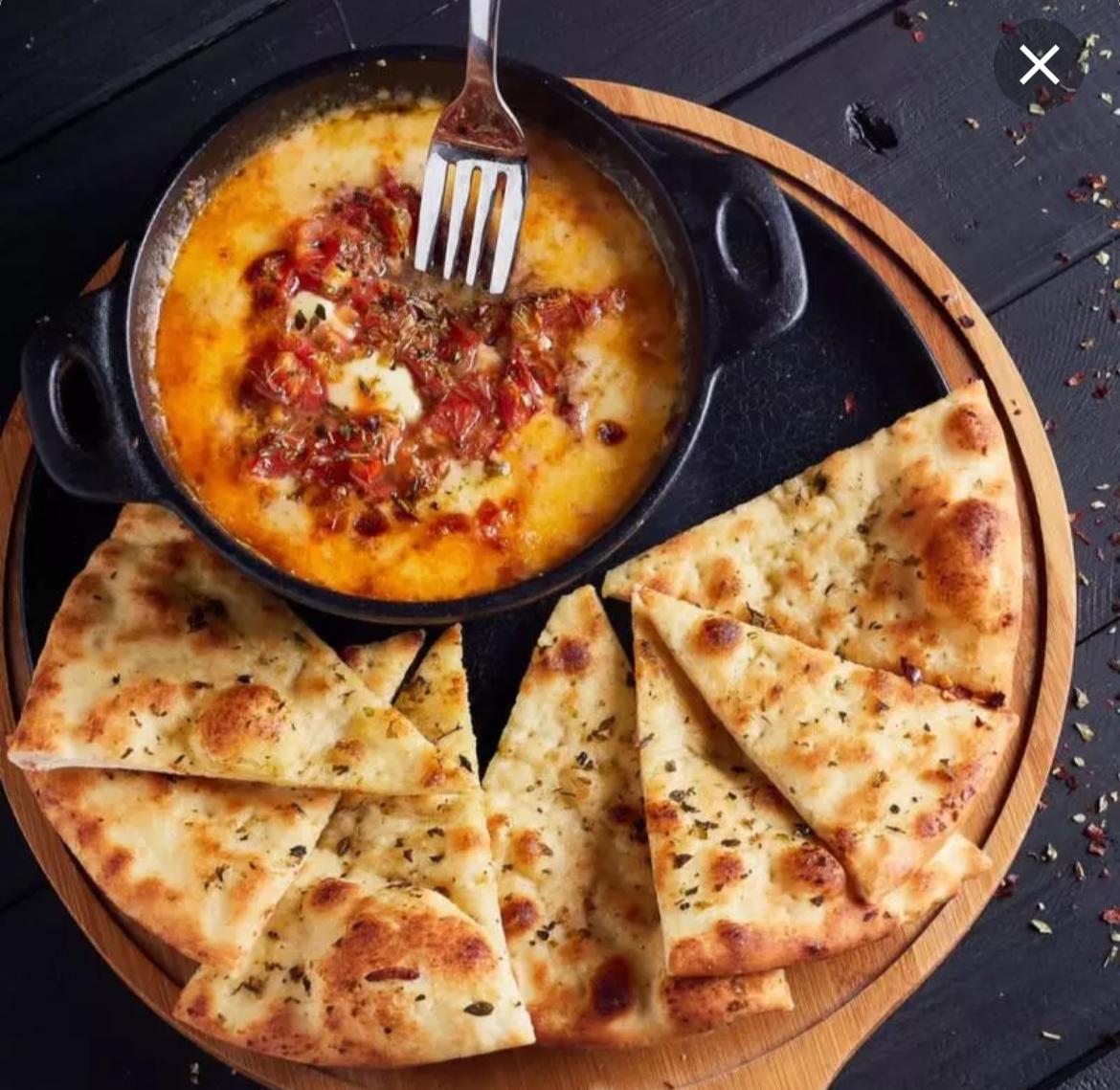 En horno de piedras con doble capa de queso, acompañado en pan tipo árabe.