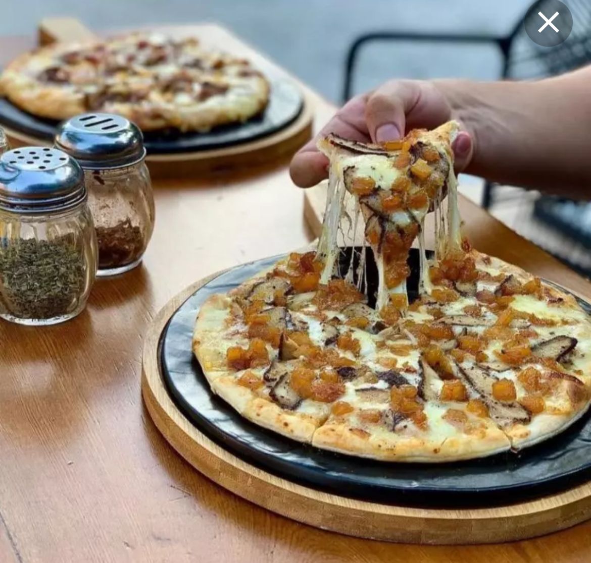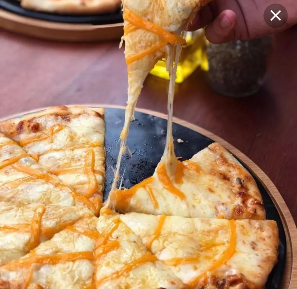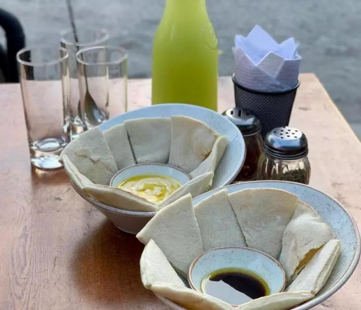 En horno de piedras con doble capa de queso, acompañado en pan tipo árabe.