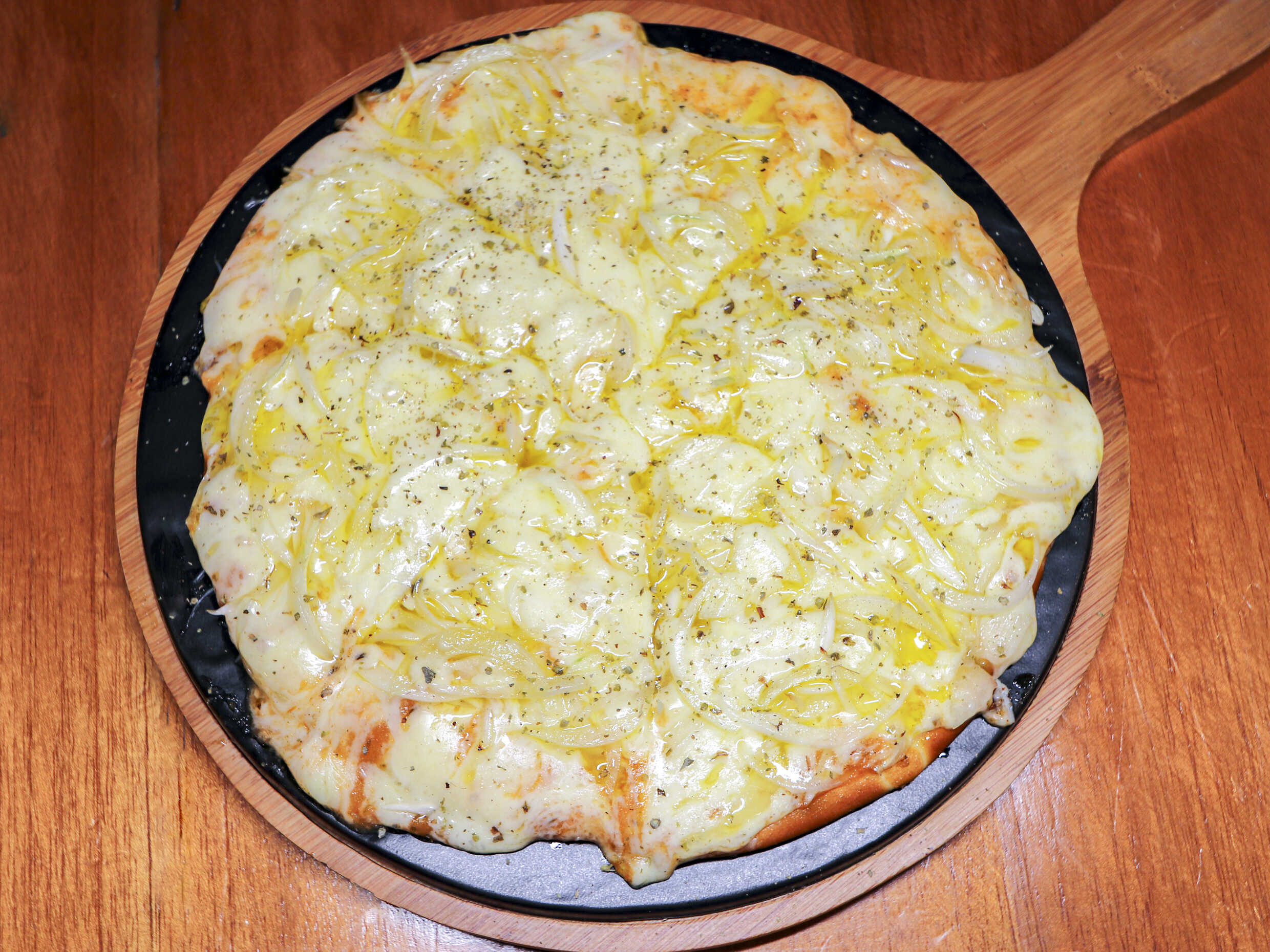 Ingredientes: cebolla en julianas adobada en aceite de oliva extra virgen y queso mozzarella extra.