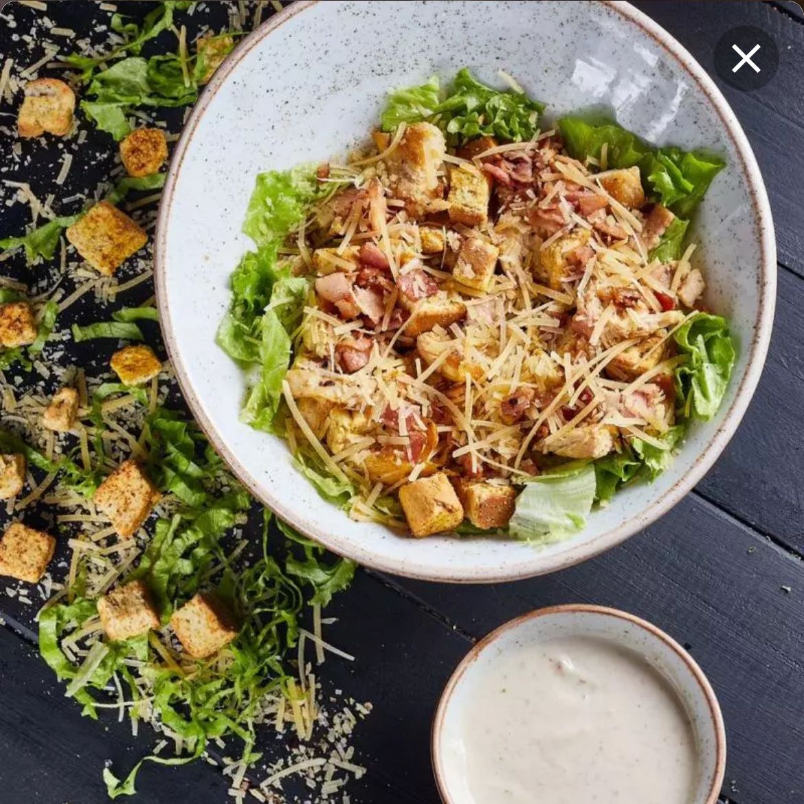 Ensalada con lechuga romana, crutones, tocineta ahumada, pollo grillé, queso parmesano y salsa blanca del chef.