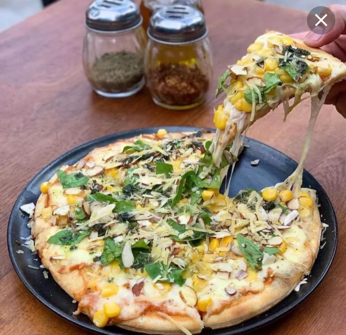 Ingredientes: maíz dulce, almendras fileteadas, salsa pesto, rúgula y parmesano.