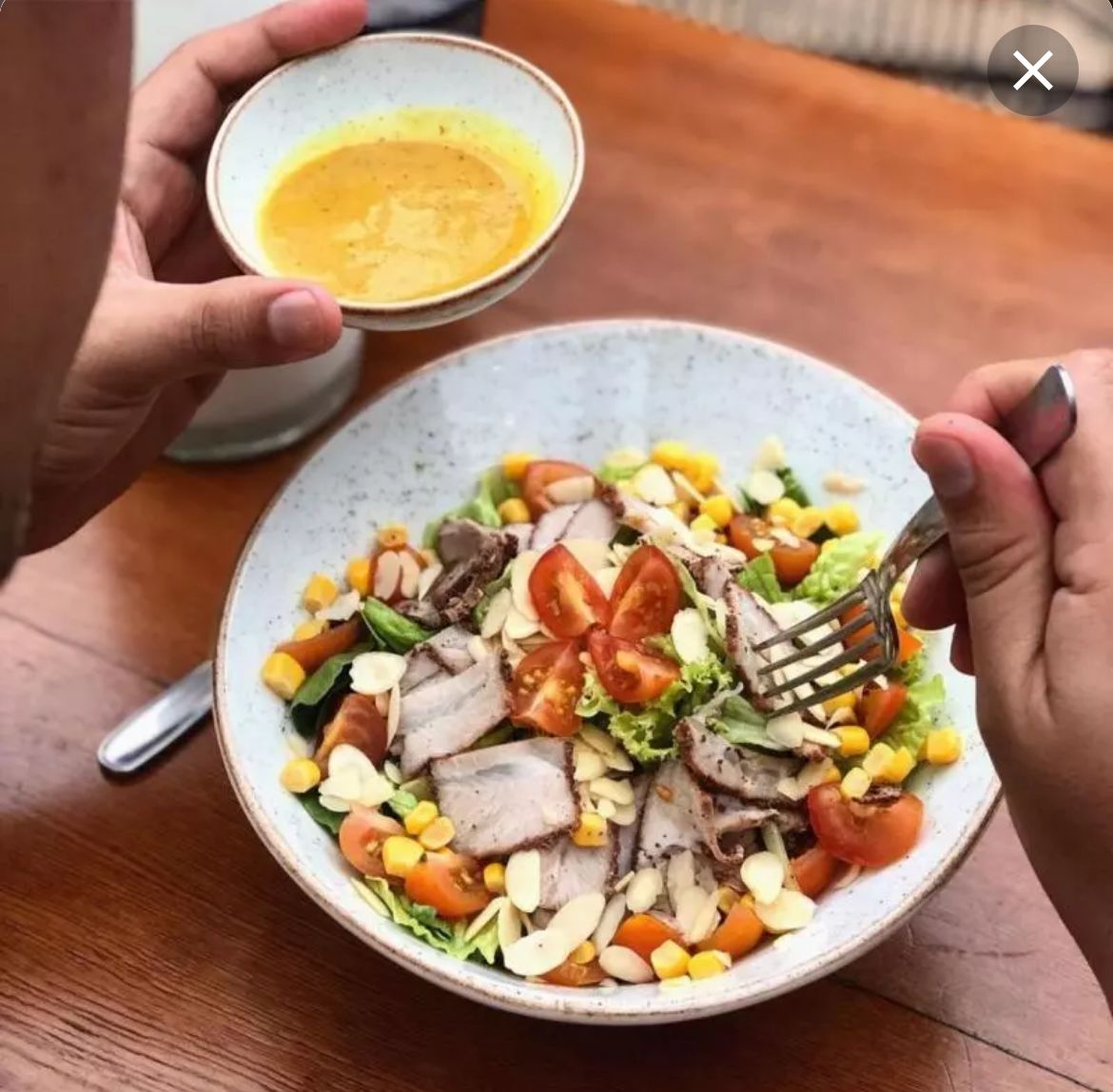 Ensalada con lonjas de jamón, pernil, magro cocinado a base de especias, acompañado con maíz dulce, almendras fileteadas, lechuga romana, rúgula, tomates cherrys y salsa a base de miel y mostaza.